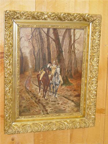 LATE 19TH-EARLY 20TH CENT. OIL ON CANVAS OF ENGLISH COUPLE ON HORSEBACK IN A FOREST PATH, UNSIGNED, MOUNTED ON ARTIST BOARD IN A CARVED GILT PLASTER FRAME (23 1/2" X 17 3/4"-SIGHT) - REPAIRS & IMPERFECTIONS;