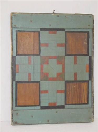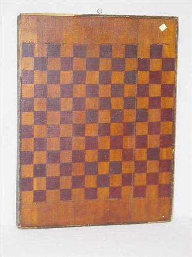 LATE 19TH-EARLY 20TH CENT. PAINTED DOUBLE SIDE GAMEBOARD: FRONT SIDE-PARCHESSI & BACK SIDE-CHECKERS - PAINT WEAR & LOSS TO BORDER TRIM ON BACK;