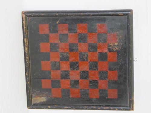 LATE 19TH-EARLY 20TH CENT. PAINTED GAMEBOARD W/ RED & BLACK CHECKER BOARD TOP & GALLERY - PAINT WEAR & LOSSES