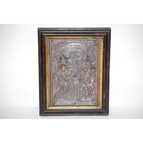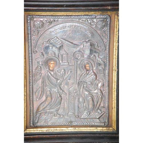 LATE 20TH CENT. GREEK RELIGIOUS ICON OF AN ARCANGEL & A THRONED HOLY MAN IN THE ARCHAIC MANNER W/ REPOUSSE .950 SILVER OVERLAID PAINTING W/ GREEK ALPHABET TITLE IN A PLASTER FRAME (7 1/2" X 5 1/2") - WEAR, OXIDATION & IMPERFECTIONS