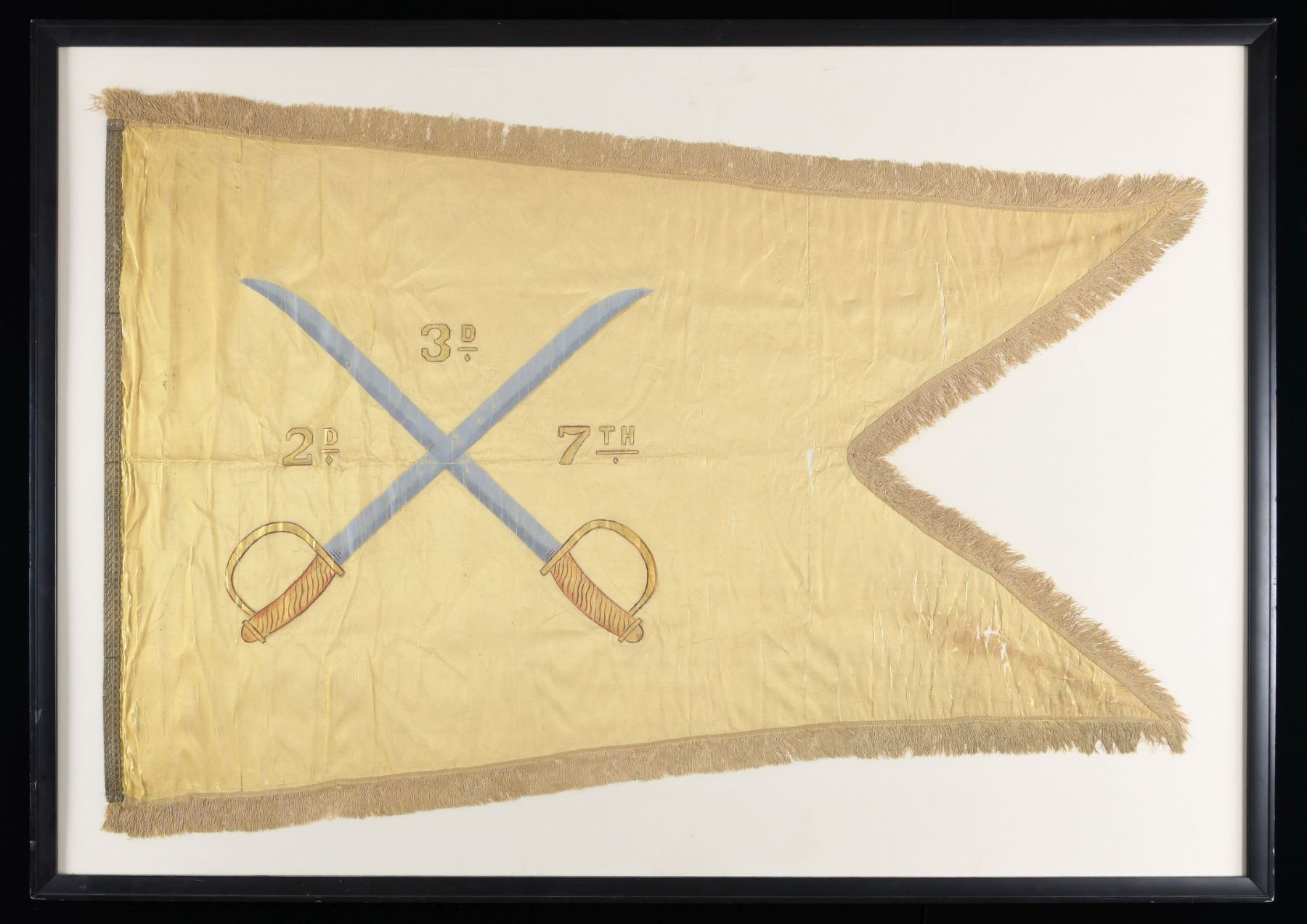 Please note as of 4/8/25 this item description has been updated. Please revisit this description and contact us with any questions. This fine example of a cavalry guidon appears to be regulation for the State of Rhode Island starting in 1864. The guidon of the 1st Cavalry of Rhode Island is in the State collection and looks very similar to the guidon offered here and is considered a sister flag to this example. The 2nd, 3rd, and 7th Cavalry squadrons of Rhode Island were merged in 1864 and this guidon was likely produced during that period, and likely used for several years after. The guidon measures approximately 43" by 38" at the hoist and 22 1/2" at the tips. The yellow silk flag has a yellow fringe on all sides except the hoist. The flag portrays painted crossed sabers with blue blades and red striped gold hilts, quartered by the letters "2D", "3D" and "7TH". The hoist of the guidon has a 3/4" decorative bouillon tape. The flag is enclosed in a black finished wooden frame measuring 34 1/2" by 48 1/2" and has not been examined out of the frame. This guidon may date as late as the 1880’s and was possibly used by the Rhode Island Veteran’s Association. CONDITION: the flag displays superbly with a very impactful visage. The painted colors are brilliant and, as expected, the yellow silk has faded some. The silk body does show some deterioration toward the end of the guidon. (02-23604/BF). $8,000-12,000.