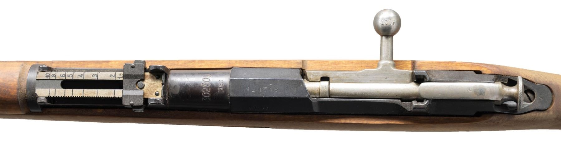 Cal. 7.62x54R. S# 302609. Bbl. 27" with Century import marking. Standard M39 military sights. Matching numbers on bbl. & bolt handle. Other parts are unnumbered or mismatched. 1968 dated M39 Mosin rifle likely made for training or marksmanship. Arsenal rework blued finish. Square joint stock with left & bottom mounted sling provisions. Cleaning rod present. CONDITION: stock set shows some dirt staining, handling marks & dings. Metal retains 90% arsenal rework blue with some blued over pitting, oxidation & fading on the exposed edges. Action functions properly when hand cycled. Bright near excellent bore. (25-3908/MJC). CURIO. $200-400.