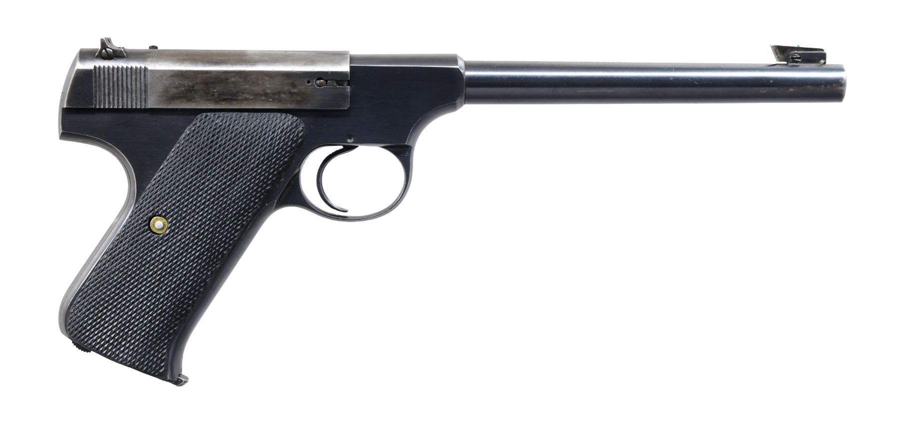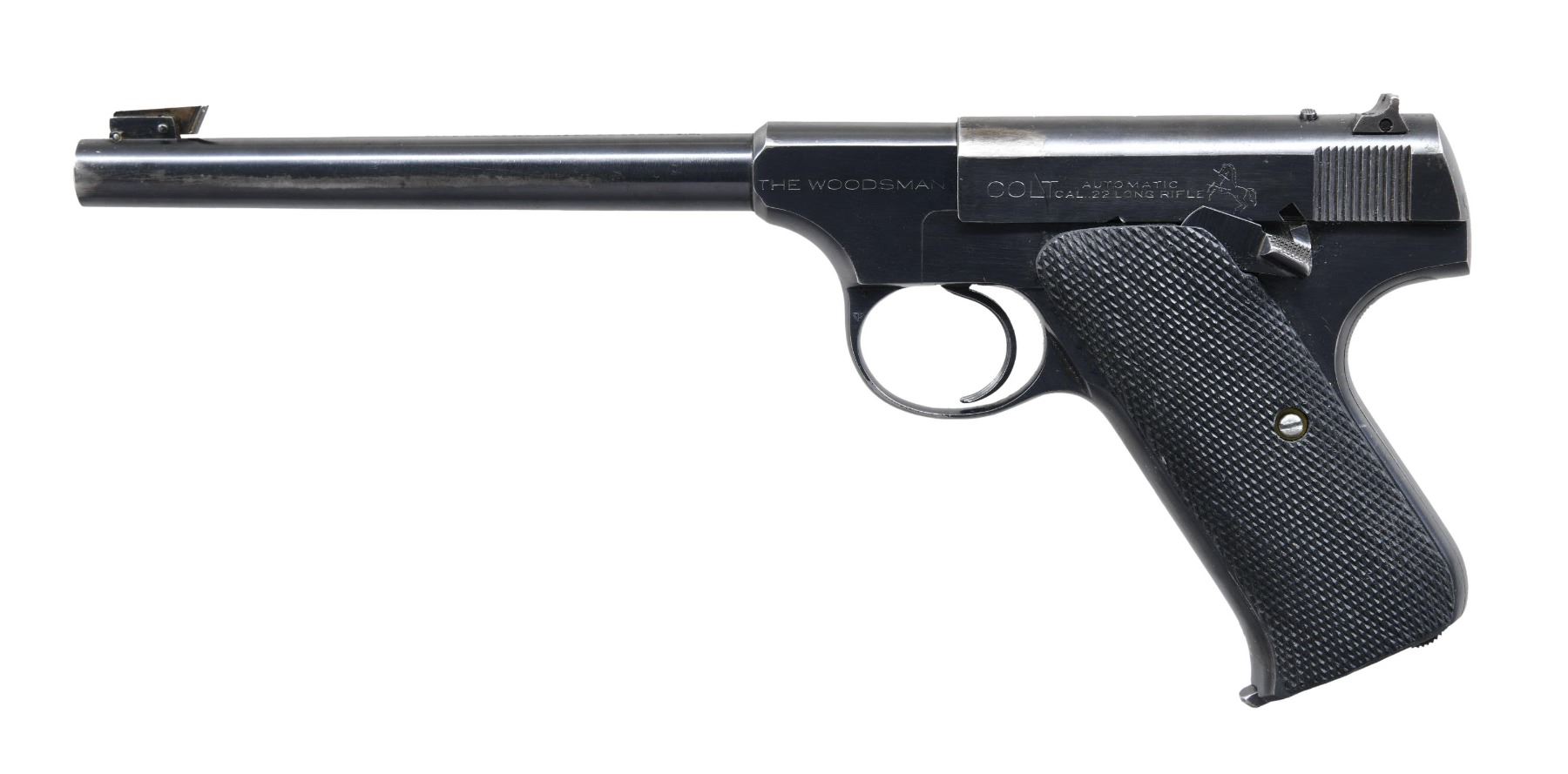 PISTOL. Cal. 22 LR. S# 152727. Bbl. 6 5/8". Woodsman semi-automatic pistol mfg. by Colt in 1941. Top of the bbl. is marked with Colt's mfg. and patent information, with "THE WOODSMAN" marked on the left side of the breech. Left side of the slide is marked "COLT," followed by the cal. designation and Rampant Colt logo. Metal components exhibit a blue finish overall. Frame is mounted with 2-piece custom black checkered wood grips. Replacement blade front sight with adjustable square notch rear sight. MAGS: One 10-rd. CONDITION: Good, with metal components retaining large amounts of their original factory blue finish, exhibiting areas of wear and thinning that show through to gray patina, with some freckling present overall. Right side of the slide, the right half of the top of the slide, and a small section on the left side of the slide exhibit striations from heavy cleaning. Mirror bore, retaining strong rifling throughout. Grips show some smoothing and some scattered marks from handling and storage, but otherwise remain sturdy and serviceable. (24-7209/MLW). CURIO. $400-600.