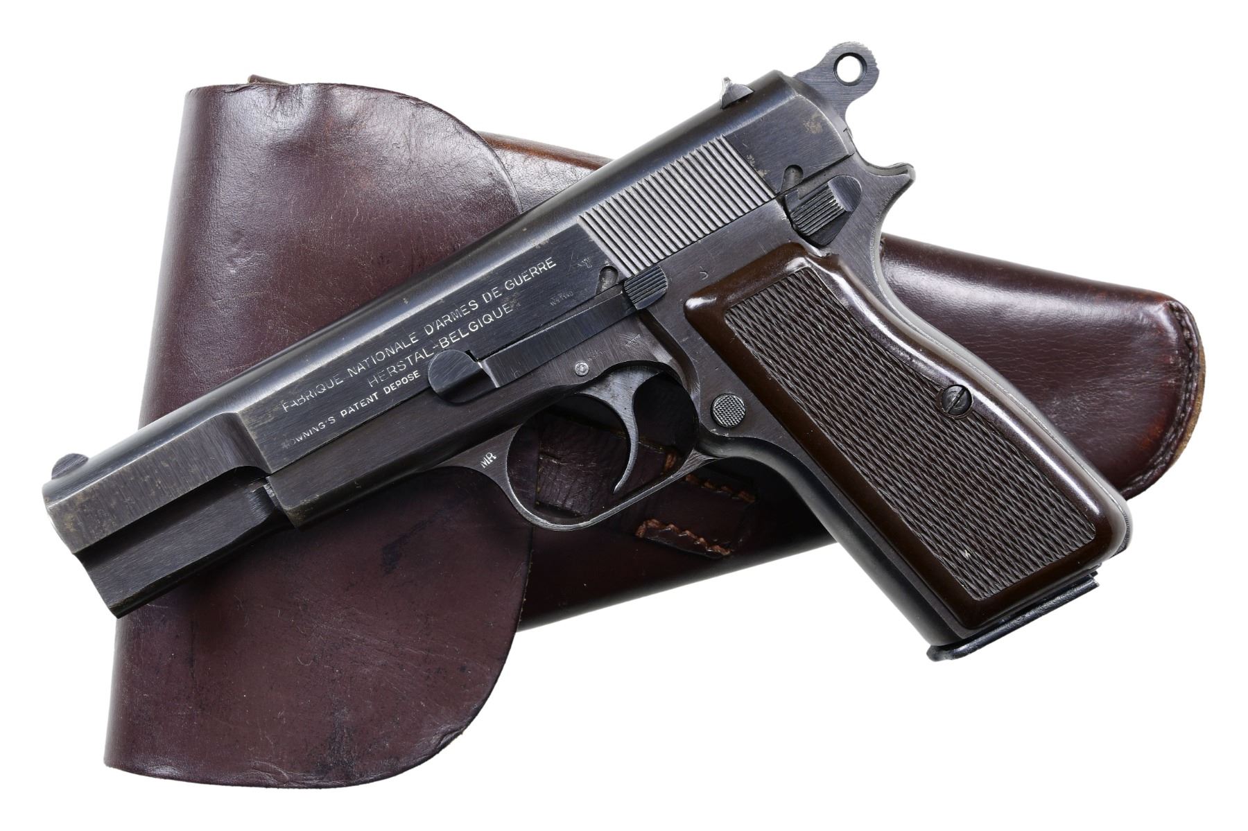 SEMI-AUTOMATIC PISTOL WITH HOLSTER. Cal. 9mm Luger. S# 22822b. Bbl. 4 5/8". High Power semi-automatic pistol mfg. in Belgium while under German occupation, circa. January to August of 1944. Left side of the slide is marked "FABRIQUE NATIONALE D'ARMES DE GUERRE/ HERSTAL-BELGIQUE/ BROWNING'S PATENT DEPOSE". Left side of the frame and slide are marked with an Eagle/WaA140 proof and eagle firing proof, with the frame also being marked "MR" on the forward trigger guard web. Metal components exhibit a blue finish overall, save for on the bbl., which is polished in-the-white. Frame is mounted with 2-piece checkered brown bakelite grips. Fixed half-moon blade front sight, with dovetailed U-notch rear sight. All serialized parts are matching, with the full S# marked on the slide and "822b" marked on the frame and bbl. MAGS: 2 13-rd. 1 mag. is blued with a partial Eagle/WaA140 proof present on the spine, with the other being parkerized and unproofed. UNATTACHED ACCESSORIES: brown leather holster marked "clg/44" beneath the closure flap strap. CONDITION: very good, with metal components retaining the majority of their original arsenal blue finish, exhibiting some areas of light to mild wear and thinning, with some scattered spots of light pitting present overall. Near mirror bore, exhibiting some light pitting, while retaining well defined rifling throughout. Brown bakelite grips are excellent, showing few light superficial handling marks overall. Holster remains malleable, exhibiting some wear and light age related cracking overall. (24-6913/MLW). CURIO. $1,200-1,800.