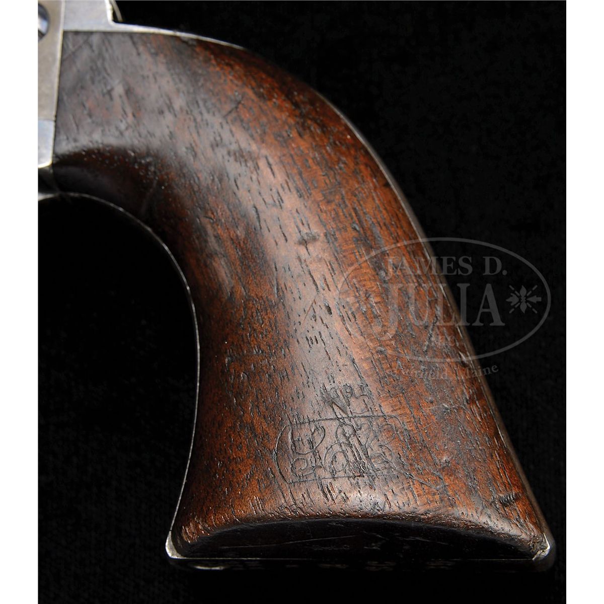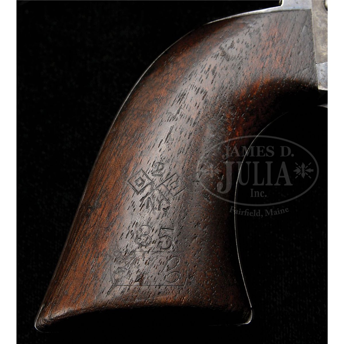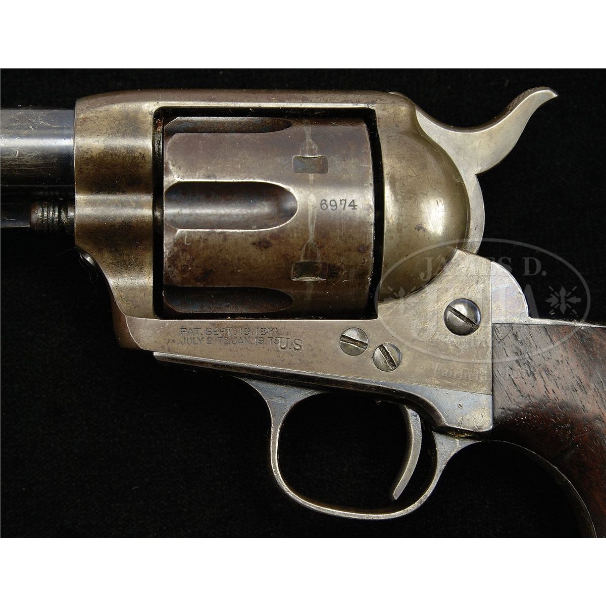 SN 136974. Cal. 45 Colt. Blue & color case hardened with 7-1/2" bbl, full front sight and 1-line block letter address. Left side of frame has the 2-line, 3-patent dates and a small "U.S". Mounted with 1-pc walnut grip that has a legible "SEB" (Capt. Stanhope E. Blunt) inspector cartouche below the date "1891". Right side of grip has the partially legible "RAC" (Rinaldo A. Carr) sub-inspector cartouche. Right side of grip also has stamped crossed signal flags with a "2" above and "NY" below which surmounts the number "35". This indicates that this revolver was assigned to 2nd Signal Brigade, New York Militia and was revolver rack #35. Buttstrap is hand-stamped "2 / SC / 35", having the same significance. Bottom of the frame by the SN, bottom of bbl, cyl and bottom left edge of grip all have the "RAC" sub-inspector initials. Trigger guard, buttstrap and front end of ejector housing are marked with the "K" inspector initial. This revolver was part of the last contract for Cavalry revolvers. Only because they were in the New York Militia Armory at the time did they escape the recalls of the 1890s and early 20th century where large numbers of Cavalry revolvers were converted to artillery configuration by having their bbls reduced to 5-1/2", usually with mixed parts. All visible numbers are matching with last four digits of matching SN on bottom of bbl & cyl. CONDITION: Fine to very fine, all matching. Bbl retains 90-92% strong orig blue with some mottling around the muzzle and thinning on left side; orig feathers are lightly visible on both sides of front sight and ejector housing stud; ejector housing retains bright blue in the gullets with the outer radius a mostly blue/brown patina; frame retains faded case colors in sheltered areas being mostly a light brown patina; cyl retains faded blue in the flutes with the outer diameter a light blue/brown patina with a few scattered spots of pitting; trigger guard & backstrap retain blue in sheltered areas with the front & backstraps blue/gray patina. Grip is sound showing moderate to heavy wear with all legends visible and retains a hand worn patina. Mechanics are fine, strong bright bore with fine frosty pitting. 4-48761 JR329