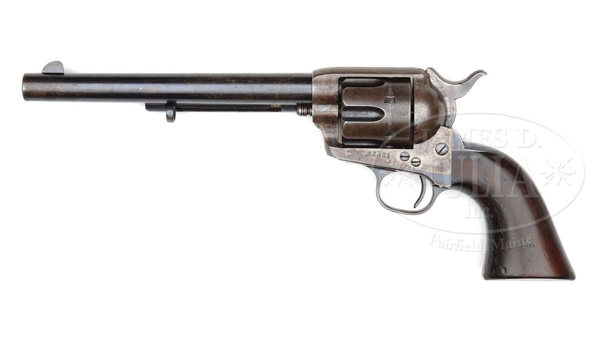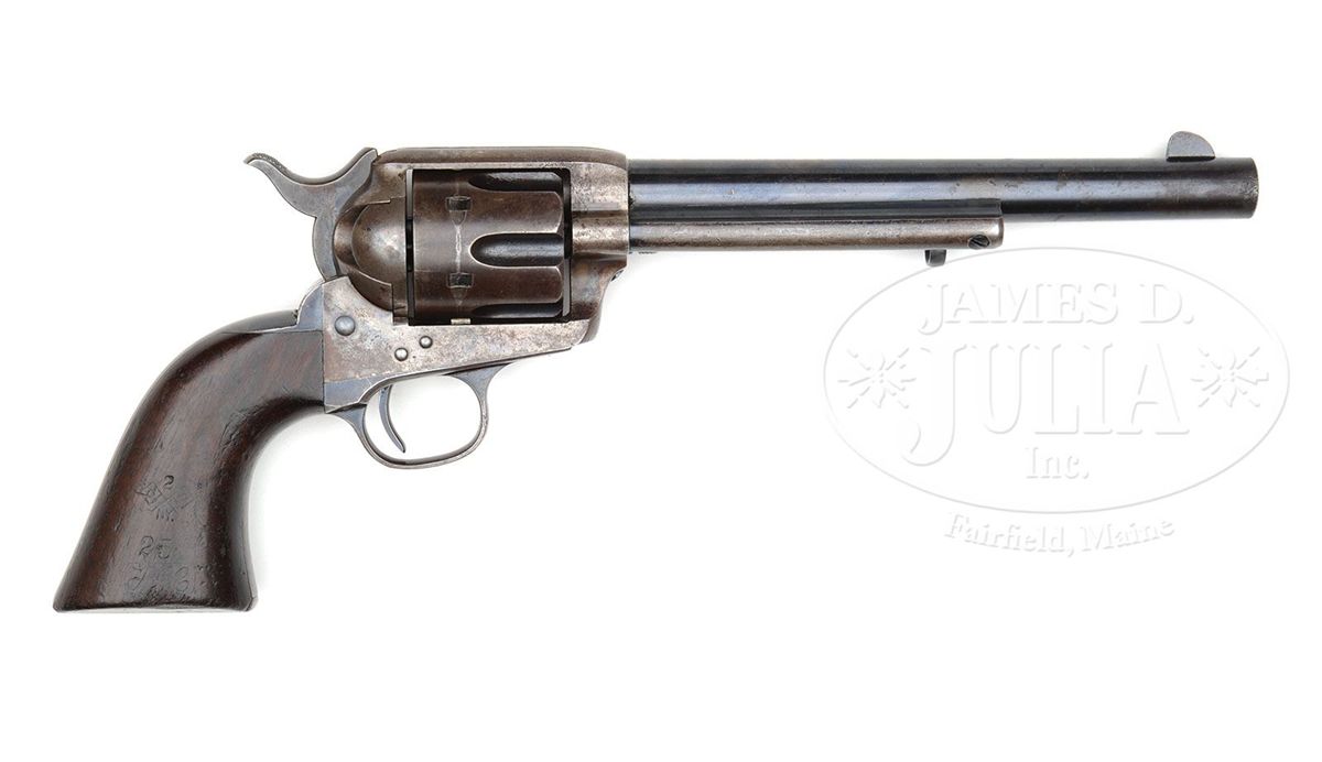 SN 140060. Cal. 45 Colt. Blue & color case hardened with 7-1/2" bbl, full front sight and 1-line block letter address. Left side of frame has the 2-line, 3-patent dates and a small "U.S". Mounted with 1-pc walnut grip that has last four digits of matching SN in backstrap channel. It shows a legible "SEB" (Capt. Stanhope E. Blunt) inspector cartouche below the date "1891" on left side. Right side of grip has the legible "RAC" (Rinaldo A. Carr) sub-inspector cartouche. Right side of grip also has stamped crossed signal flags with a "2" above and "NY" below which surmounts the number "25". This indicates that this revolver was assigned to 2nd Signal Brigade, New York Militia and was revolver rack #25. Buttstrap is hand-stamped "2 / SC / 25", having the same significance. Bottom of the frame by the SN, bottom of bbl, cyl and bottom left edge of grip all have the "RAC" sub-inspector initials. Trigger guard, buttstrap and front end of ejector housing are marked with the "K" inspector initial. This revolver was part of the last contract for Cavalry revolvers. Only because they were in the New York Militia Armory at the time did they escape the recalls of the 1890s and early 20th century where large numbers of Cavalry revolvers were converted to artillery configuration by having their bbls reduced to 5-1/2", usually with mixed parts. All visible numbers are matching with last four digits of matching SN on bottom of bbl & cyl. CONDITION: Fine, all matching including grip. Bbl & ejector housing retain 60-70% orig blue with the loss areas a medium patina, silver blue on outer radius of ejector housing with fine pitting on right side of muzzle; frame retains faded case colors in sheltered areas being mostly faded to smoky case colors and silver/brown patina; hammer retains faded case colors on sides & rear edge, turned silver on top; cyl retains thin blue in the flutes being a medium brown patina on outer diameter; trigger guard & backstrap retain blue in sheltered areas with front & backstraps a blue/gray patina. Grip is sound showing moderate to heavy wear with all cartouches and date thin but legible. Mechanics are crisp, bright shiny bore with some light frosting in the grooves. 4-48809 JR365