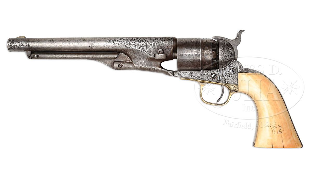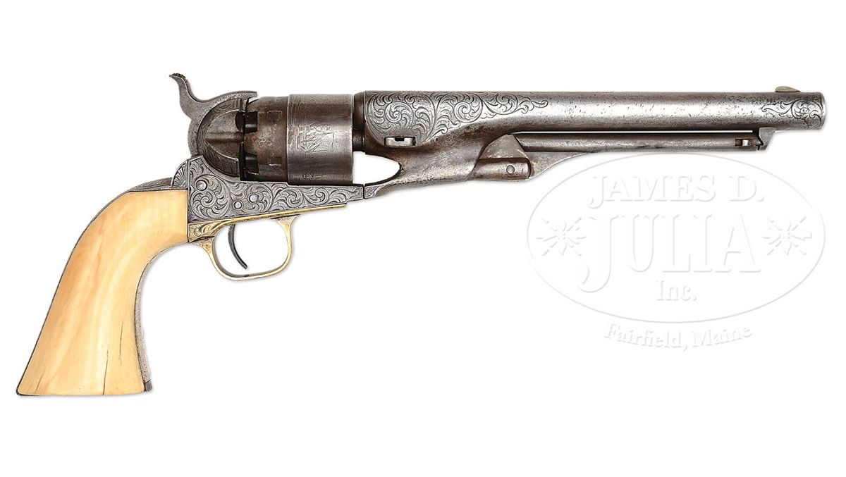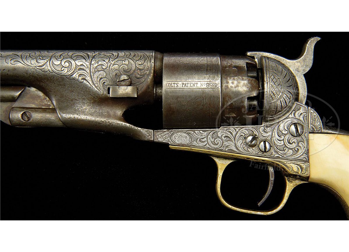 SN 188946. Cal. 44. Late 1870 production, near the end of this model run. Usual configuration with 8" rnd bbl, German silver front sight and 1-line New-York U.S. America address. Left side of frame had "COLTS PATENT" in a small oval which is now worn away with only the "C" visible. Mounted with a very early 1-pc ivory grip inscribed on the side " '72". Grip is constructed of two slabs of ivory attached to an ivory spacer block in the orig style. Revolver is engraved by L.D. Nimschke with full coverage on the frame of flowing arabesque patterns with pearled background and has his sunburst on left recoil shield with matching sunburst on top of backstrap. Foliate arabesque patterns extend over the sides of the bbl and each side of the muzzle with geometric patterns around the address. Backstrap & buttstrap are engraved to match with a fine hunter star on trigger bow. Cyl has usual 6-shots with Ormsby Naval battle scene roll marking and all six safety pins crisp & serviceable. All visible SNs are matching and are accompanied by "I.P." which stands for Ivory and Plated, which were signals to the finishing department to give extra attention to the process. CONDITION: Good, all matching except wedge which is a period of use replacement and grip which is unnumbered but original. No orig finish remains except on the trigger guard & front strap which retains about 50% orig silver plating; balance of revolver is a gray metal patina; cyl has matching patina and shows about 70% Ormsby Naval battle scene roll marking. Grip has a few age lines and is completely sound retaining a wonderful ivory patina. Mechanics are fine, worn dark bore. 4-48816 JR367