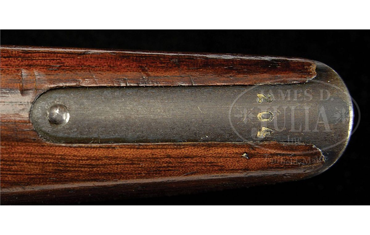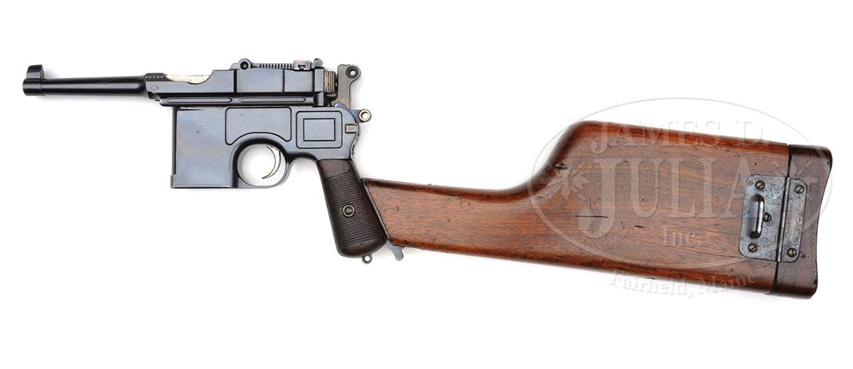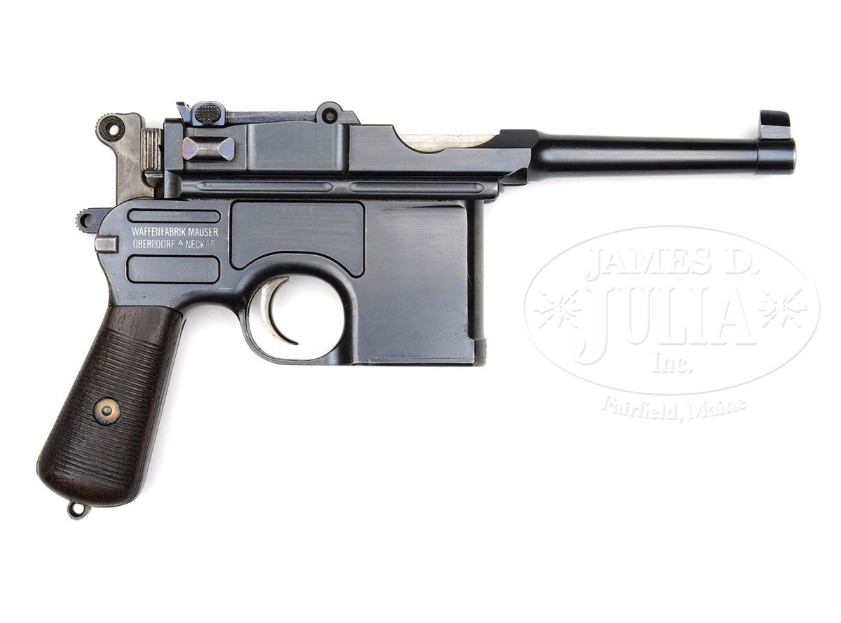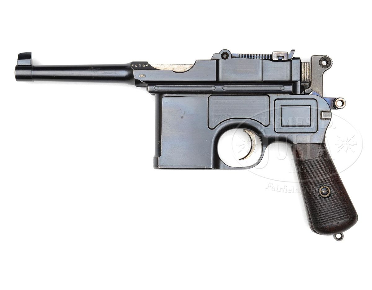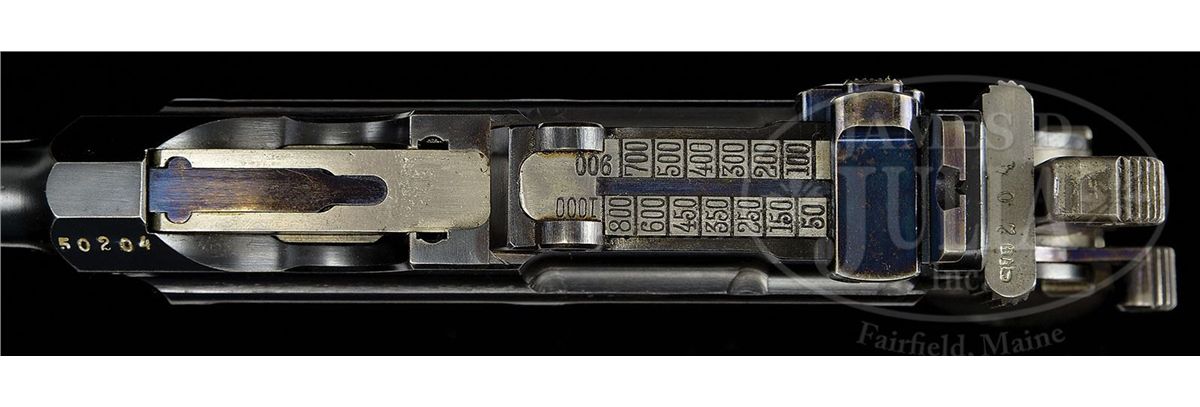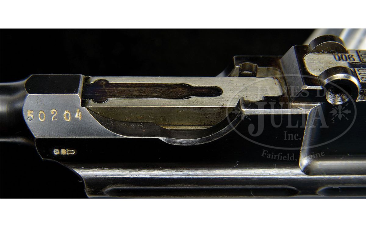 SN 50204. Caliber 9mm Export. Mauser only made a few Bolos around the 50000 serial range in caliber 9mm Export. This example has a 4" bbl and a slip-in 50-1000 rear sight. There is no chamber address. The full serial number appears on the left side of the chamber flat. A small Crown U mark is on the left side of the bbl extension. There is no marking on the right side. A standard two line address is on the right side of the frame. The matching of last three digits of the serial number are marked under the sight bar, on the bolt stop, on the bolt, hammer, subframe, and frame. This gun has a short fire blued extractor and a two lug firing pin. Fire blued small parts include the extractor, cursor, bolt stock, firing pin, safety, and grip screw. The trigger is strawed. Standard walnut grips with original finish. No lanyard ring. All matching numbers on disassembly (that shows a grooved follower) except the grips that are numbered 56. Accompanied by correct and all original Bolo stock with lug numbered 204. PROVENANCE: Joseph J. Schroeder, Jr. Collection. CONDITION: Strong 97% original blue except the front and back straps that have largely faded to a gray-brown. Comparable condition fire blue on the extractor, cursor, bolt stop, and safety, comparable condition straw on trigger. Near excellent and all original Bolo stock with scattered handling dings and dents. No cracks. Early oxidative changes on lug has transitioned the color to a gray-brown-blue. More extensive oxidation on hinge that shows minor cleaning. Solid lid with no cracks or internal modifications. It is very difficult to find an all original and matching Bolo rig, never mind an early example in 9mm Export! 4-48573 LMA17