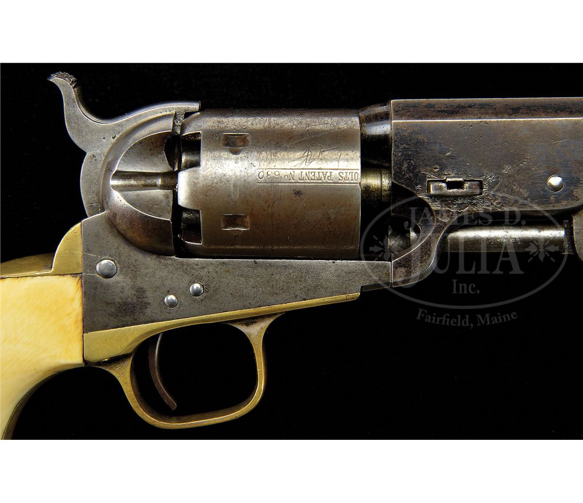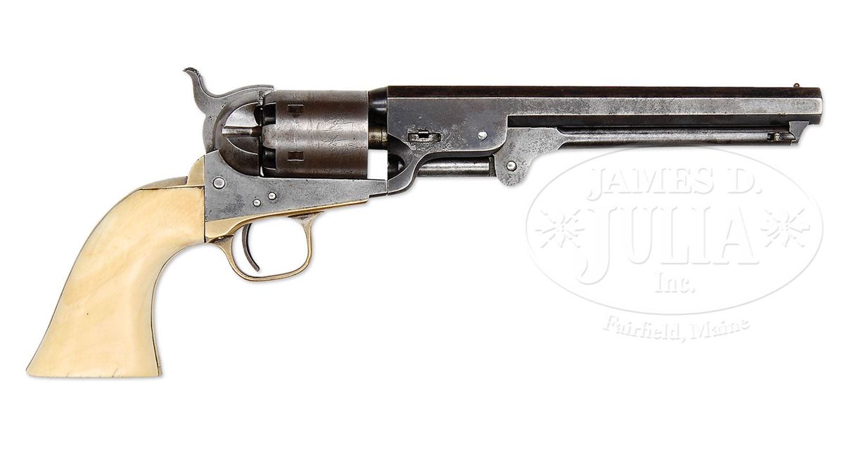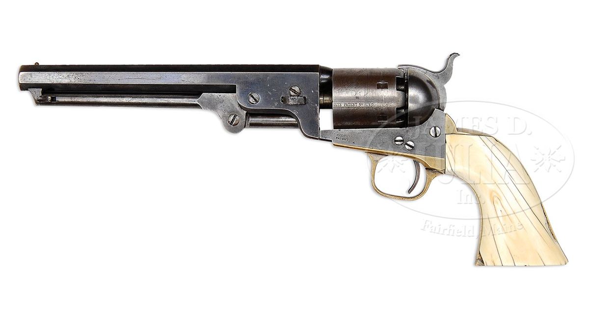 SN 214630. Cal. 36. Usual configuration with 7-1/2" oct bbl, brass pin front sight and 1-line New-York U.S. America address. Left side of frame has a small "Colts Patent" and the left shoulder of trigger guard has the cal marking. Cyl is usual 6-shots with the Ormsby Naval Battle Scene roll-marking. The 4th type large brass trigger guard and backstrap contain an unnumbered, orig type ivory 1-pc grip. Wedge is a period of use replacement which bears the SN "110905". Rammer is properly unnumbered. According to Flayderman's Guide to Antique American Firearms there were 215,348 of these revolvers produced in the period 1850-1873. This being one of the later production pieces, it would not have seen service during the Civil War but almost certainly would have been used on the American Frontier during the great Westward expansion of Manifest Destiny. These revolvers were extremely popular in all facets of American frontier life and famous as well as notorious individuals on both sides of the law were known to have carried and used them very effectively. Wild Bill Hickok carried a matched pair of '51 Navy Colts and used them with deadly effect, as history records. CONDITION: Very good. Bbl retains 50-60% orig blue with some fine pitting on right side; rammer and handle are mostly a gray patina with the right side of pivot having been lightly cleaned; frame and hammer are mostly a cleaned gray metal patina; cyl is a matching patina and shows about 50% Ormsby Naval Battle Scene; trigger guard and backstrap retain silver in the most sheltered areas with the balance a dark mustard patina; grip shows numerous age lines, mostly on the bottom and left side, with a chip in the left toe and left side of backstrap and retains a wonderful mellow ivory patina; timing needs adjusting, otherwise mechanics are fine; strong bright bore with moderate to heavy pitting. 4-47557