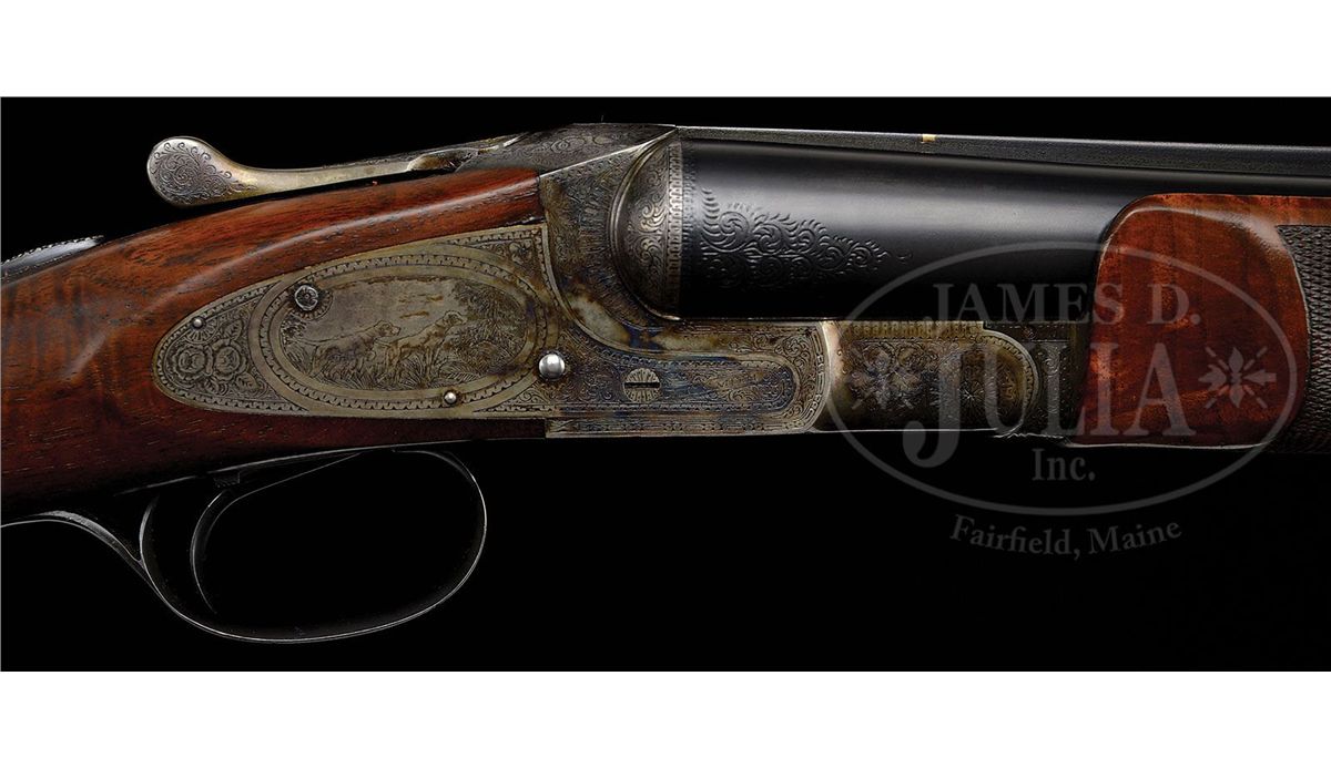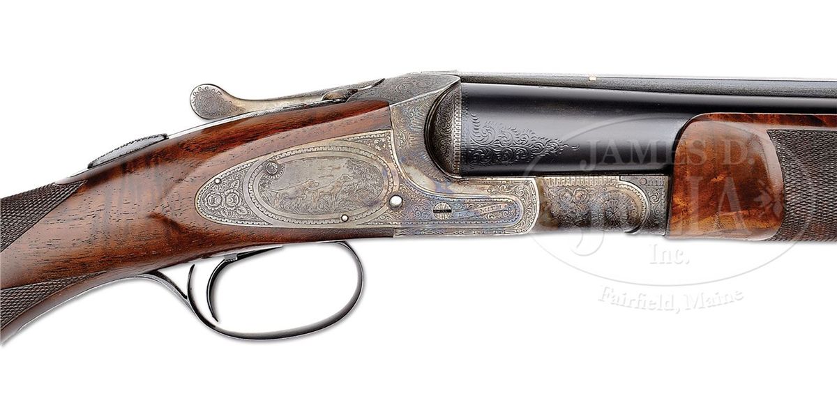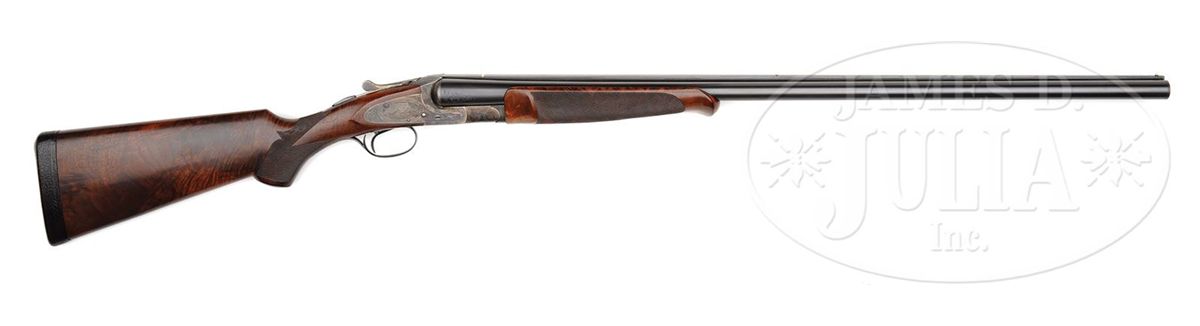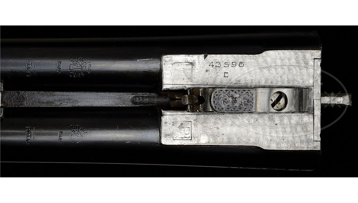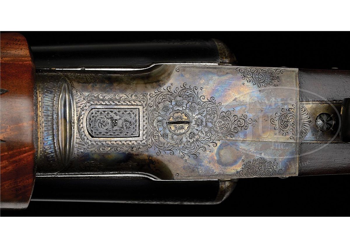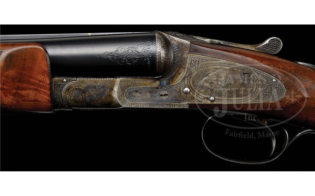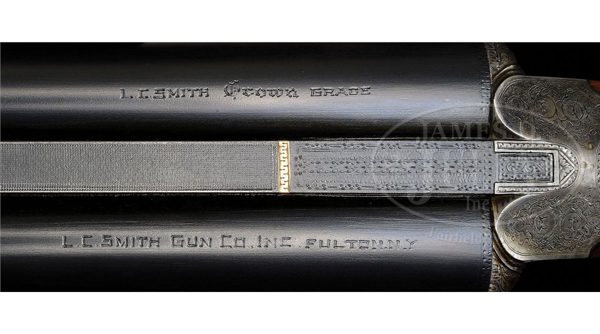 SN FWE43596. (1950) Cal. 12 ga. 2-3/4" Chambers. 30" Bbls with high, single sighting plane, matted rib fitted with two ivory beads, are engraved "L. C. SMITH Crown GRADE" and "L. C. Smith Gun Co. Inc. Fulton. N. Y" on tops.There are 1-1/2" triangles of scroll at breech ends, and geometric bands at muzzles. Engine turned bbl flats are engraved with SN, "C", and Hunter proofs. Bottoms of bbls are stamped with Nitro Steel logos. Case hardened featherweight action is engraved with SN and "C" on water table. There are nicely filed beads around fences, and action is fitted with Hunter selective "One Trigger". Action is engraved with 60% coverage small scroll with floral highlights within geometric borders. Lockplates with "L. C. Smith" at fronts, also have scroll engraving with floral accents surrounding oval vignettes of engraved and etched gun dogs in appropriate settings; a pair of setters on point on left lock, and pointers on right. A gold crown is inlaid on top lever. Steel trigger guard is engraved with roses on bow and has SN at grip. Boldly feather crotch figured, dense American walnut capped pistol grip buttstock measures 14-1/4" over dark brown leather covered pad. Wraparound grip checkering is of point pattern with small flourish at rear. Large, schnabeled, beavertail, ejector forend has oval secondary latch escutcheon. Bore diameter: left-.727, right -.727. Bore restrictions: left -.032 (Full), right -.019 (Mod). Wall thickness: left -.032, right -.032. Drop at heel: 2-7/16", drop at comb: 1-7/16". Weight: 7 lbs. 14 oz. LOP: 14-1/4". PROVENANCE: Hunter Arms Co letter with specifications for this gun, that it was finished Mar 9, 1950, and that only 11 other Crown grades had identical features to this gun. CONDITION: Excellent. Bbls retain 95% + what appears to be orig blue, although engraving is slightly softened. Action retains approx 90% orig case hardening color, silvered slightly on sharp edges, fences, and considerably on top. Lockplates retain most of their orig color hardening, thinned toward back. Stocks retain nearly all of what appears to be their orig oil finish, grain slightly open and raised, with a few light scratches and minor marks. Checkering is slightly worn and darkened. Leather covered pad is new. Bores are excellent. Action is tight. Trigger works in right/ left position, but will not select due to congealed oil. Ejectors are slightly out of time. Recent research finds that a total of 827 Crown grades were produced, 204 were in 12 ga. with 30" bbls. 4-49269 MGM137