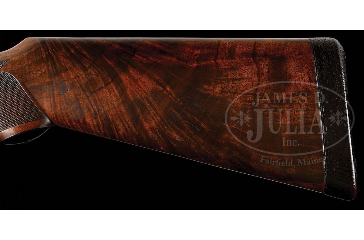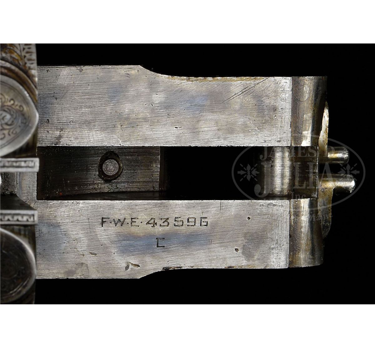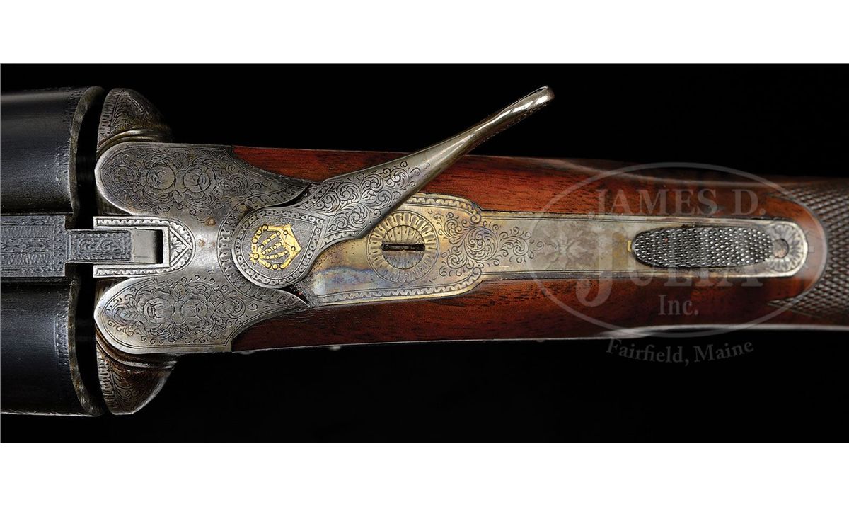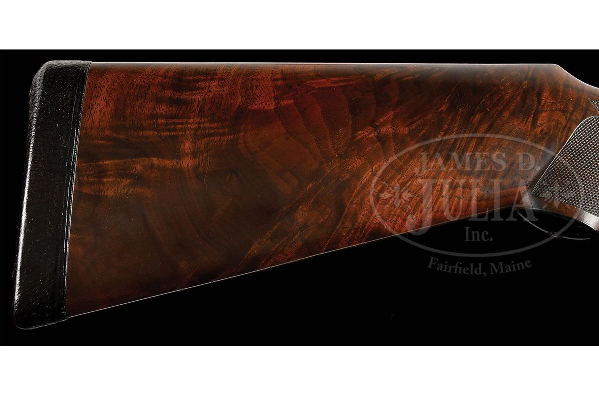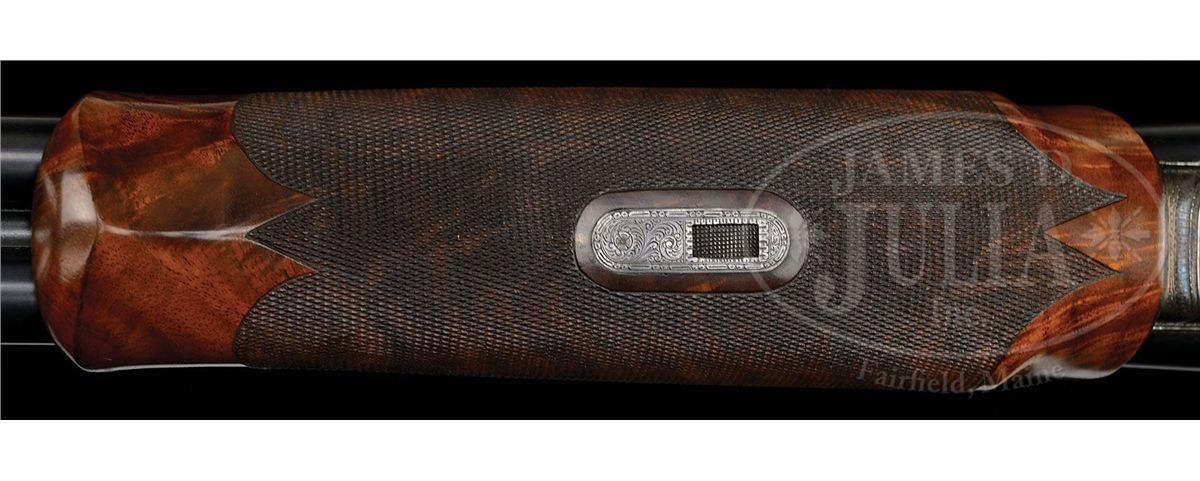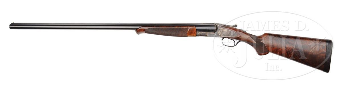 SN FWE43596. (1950) Cal. 12 ga. 2-3/4" Chambers. 30" Bbls with high, single sighting plane, matted rib fitted with two ivory beads, are engraved "L. C. SMITH Crown GRADE" and "L. C. Smith Gun Co. Inc. Fulton. N. Y" on tops.There are 1-1/2" triangles of scroll at breech ends, and geometric bands at muzzles. Engine turned bbl flats are engraved with SN, "C", and Hunter proofs. Bottoms of bbls are stamped with Nitro Steel logos. Case hardened featherweight action is engraved with SN and "C" on water table. There are nicely filed beads around fences, and action is fitted with Hunter selective "One Trigger". Action is engraved with 60% coverage small scroll with floral highlights within geometric borders. Lockplates with "L. C. Smith" at fronts, also have scroll engraving with floral accents surrounding oval vignettes of engraved and etched gun dogs in appropriate settings; a pair of setters on point on left lock, and pointers on right. A gold crown is inlaid on top lever. Steel trigger guard is engraved with roses on bow and has SN at grip. Boldly feather crotch figured, dense American walnut capped pistol grip buttstock measures 14-1/4" over dark brown leather covered pad. Wraparound grip checkering is of point pattern with small flourish at rear. Large, schnabeled, beavertail, ejector forend has oval secondary latch escutcheon. Bore diameter: left-.727, right -.727. Bore restrictions: left -.032 (Full), right -.019 (Mod). Wall thickness: left -.032, right -.032. Drop at heel: 2-7/16", drop at comb: 1-7/16". Weight: 7 lbs. 14 oz. LOP: 14-1/4". PROVENANCE: Hunter Arms Co letter with specifications for this gun, that it was finished Mar 9, 1950, and that only 11 other Crown grades had identical features to this gun. CONDITION: Excellent. Bbls retain 95% + what appears to be orig blue, although engraving is slightly softened. Action retains approx 90% orig case hardening color, silvered slightly on sharp edges, fences, and considerably on top. Lockplates retain most of their orig color hardening, thinned toward back. Stocks retain nearly all of what appears to be their orig oil finish, grain slightly open and raised, with a few light scratches and minor marks. Checkering is slightly worn and darkened. Leather covered pad is new. Bores are excellent. Action is tight. Trigger works in right/ left position, but will not select due to congealed oil. Ejectors are slightly out of time. Recent research finds that a total of 827 Crown grades were produced, 204 were in 12 ga. with 30" bbls. 4-49269 MGM137