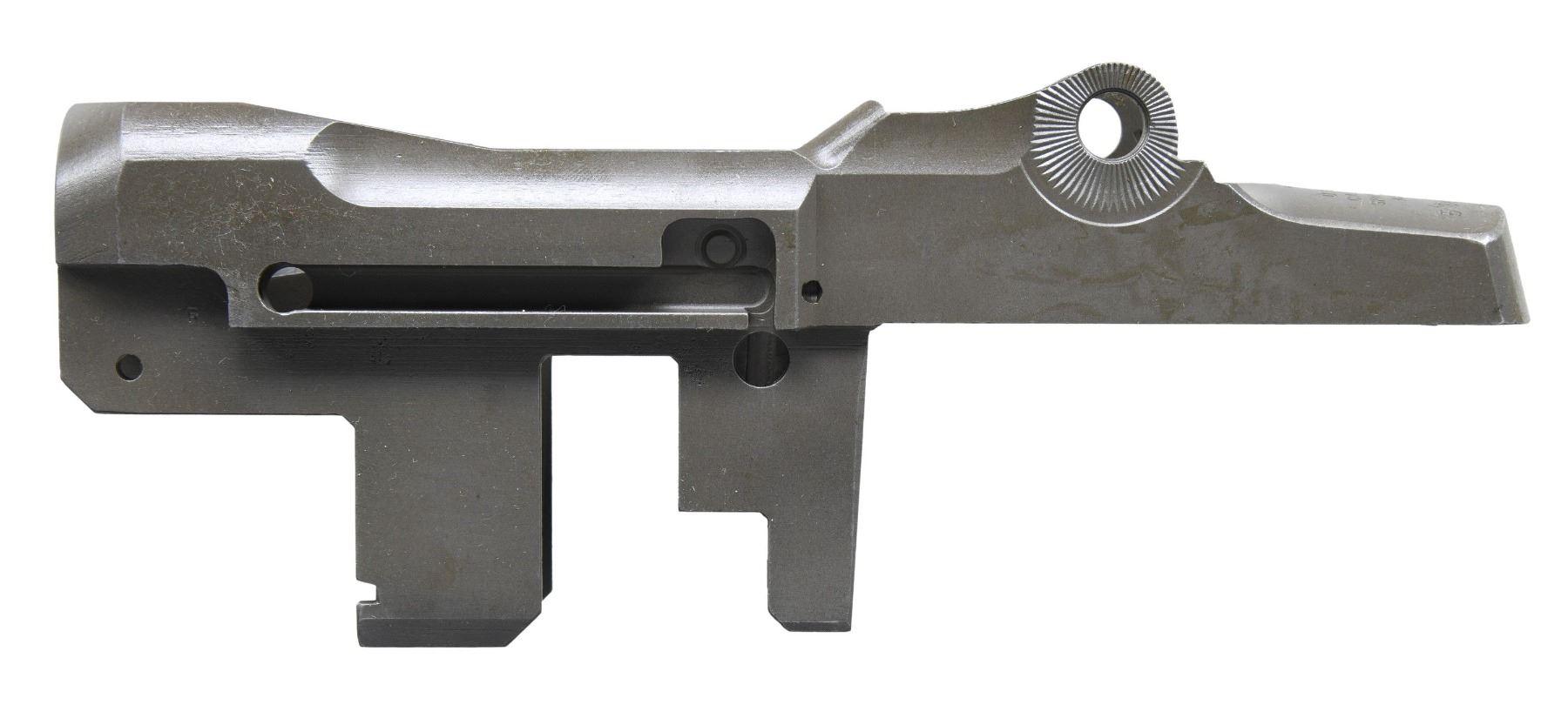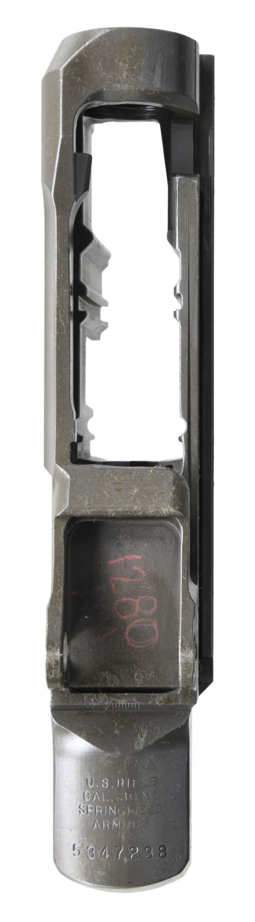 RECEIVER. S# 5347238. This receiver manufactured in the post-Korean War era has the standard Springfield markings at the heel. Numbered at the right front end w/ "F 6528291" & has the heat lot number "A 57". Receiver contains no additional parts. CONDITION: the rear sight notches appear to have light wear. The receiver retains most of its arsenal rework gray-green Parkerization over several small areas of very fine pitting below the wood line & a slight trace of pitting at the forward end of the receiver ring. (25-3082/RW). MODERN. $400-600.