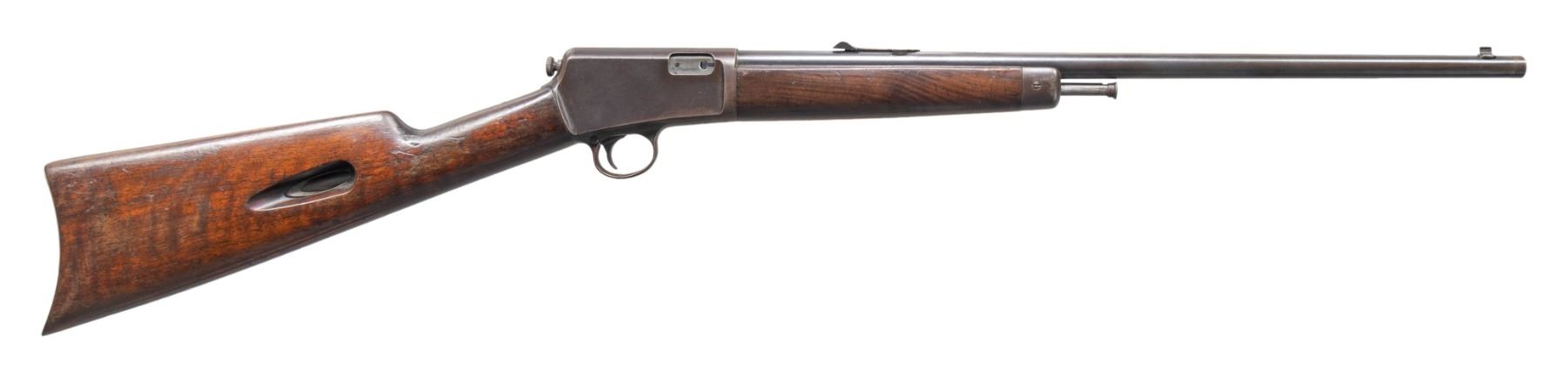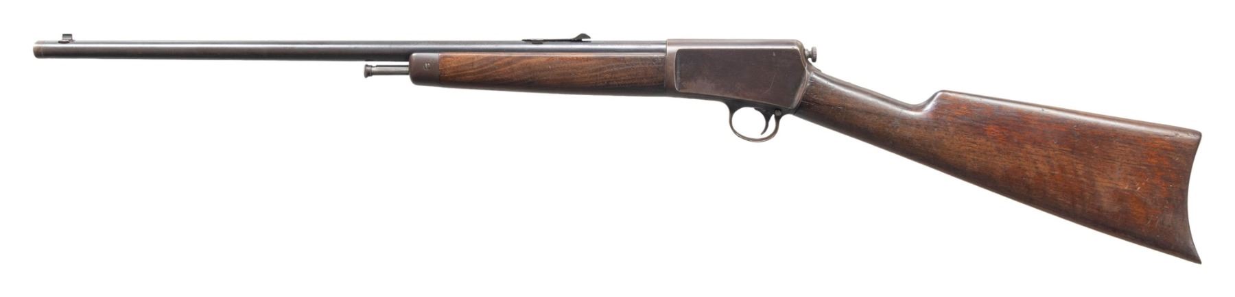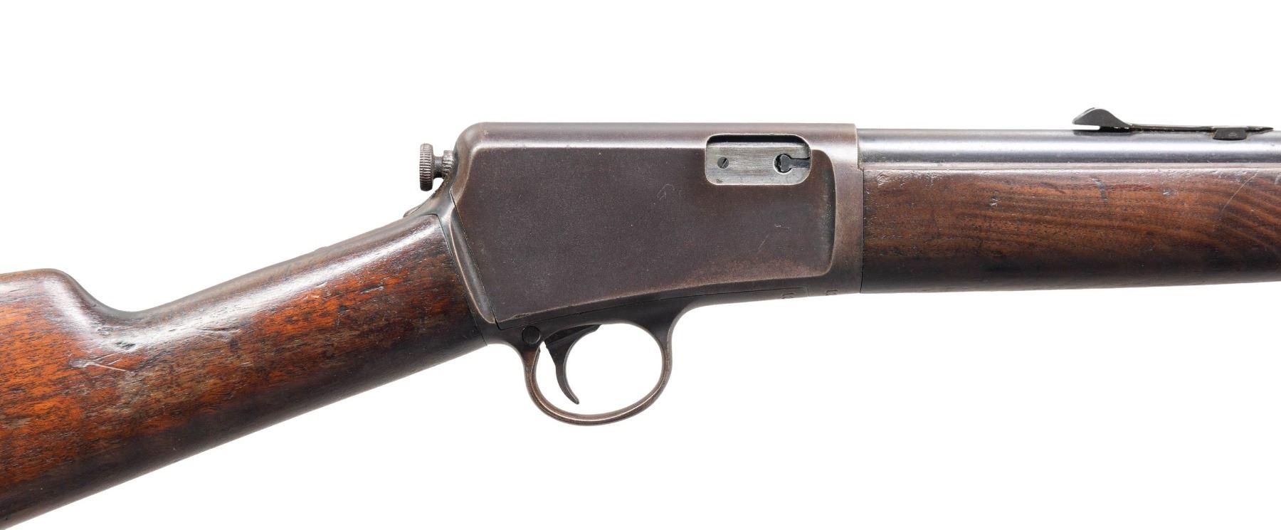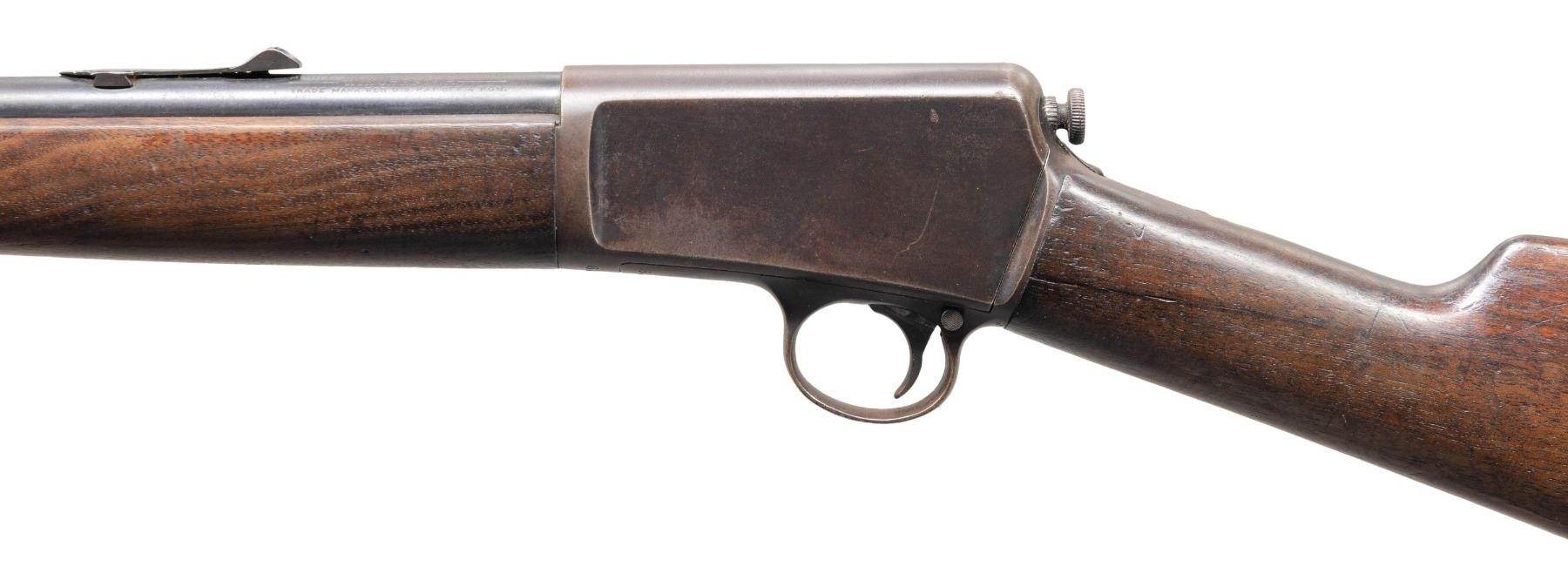 RIFLE. Cal. 22 Auto. S# 122379. Bbl. 20". Model 03 (1903) semi-automatic rifle mfg. by Winchester in 1935. Left side of the bbl. exhibits standard factory markings denoting Winchester's mfg. and patent information, as well as the model and cal. designations. Metal components exhibit a blue finish overall, save for on the bolt and plunger bar. Plain wood forearm and straight grip stock with crescent steel buttplate. Blade front sight with U-notch rear sight. Matching numbers are present on the upper and lower assemblies. Bbl. has been sleeved. CONDITION: metal components retain good amounts of their original factory blue finish, showing areas of wear and thinning fading to gray patina, scattered spots of light surface oxidation, as well as consistent light pitting on the receiver. Very bright bore, retaining well defined rifling throughout. Proper manual mechanics. Wood furniture shows scattered marks, scratches, and impressions from handling and storage, with the buttstock exhibiting a crack on the left side and top of the wrist. (25-4270/MLW). CURIO. $250-400.