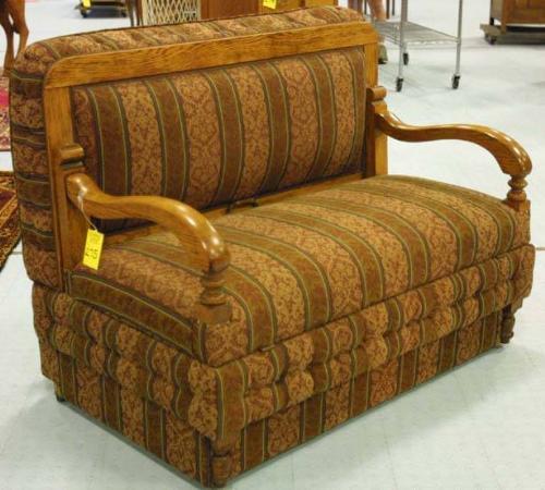 LATE VICTORIAN OAK UPHOLSTERED HIDE-A-BED SOFA height: 50", width: 39"