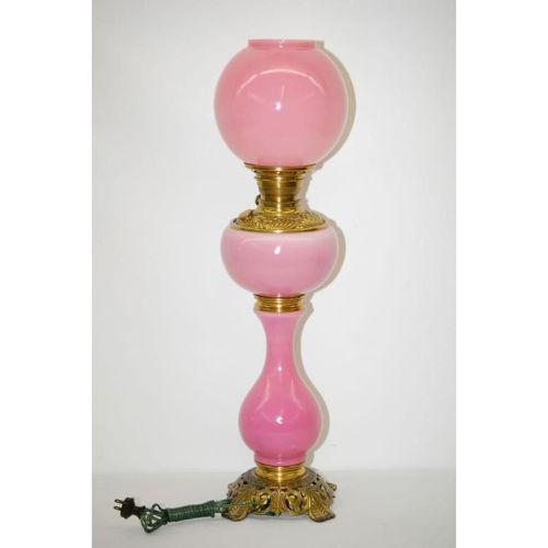 LATE VICTORIAN PINK BRISTOL GLASS PARLOR LAMP W/ PIERCED CASED METAL BASE, BRASS FITTINGS & BURNER, ORIGINAL GLASS SHADE-UNMARKED (28" T) - ELECTRIFIED, MINOR WEAR