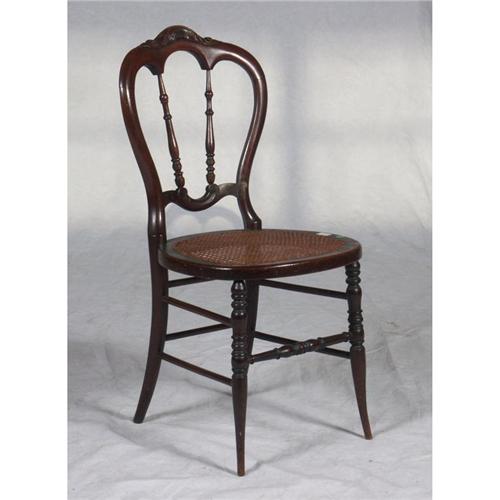 SIDE CHAIR: Late Victorian walnut side chair, carved crestrail, turned spindle back, cane seat, turned front legs and stretcher.