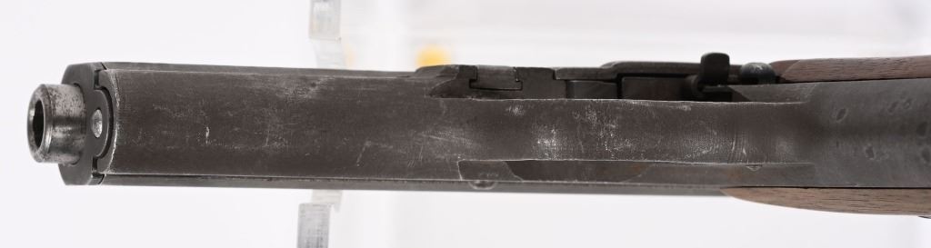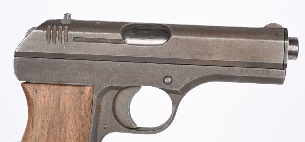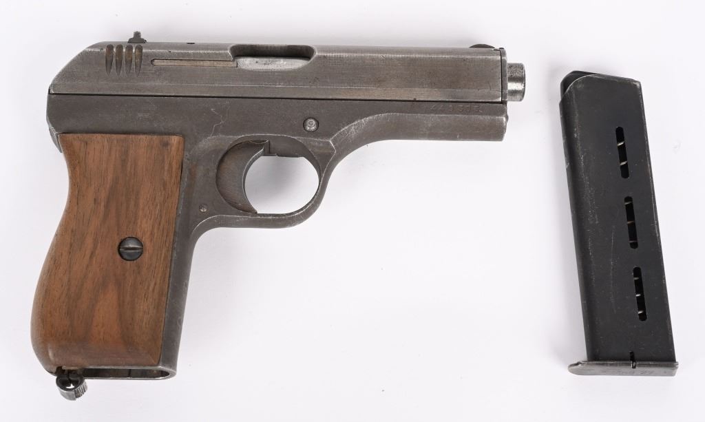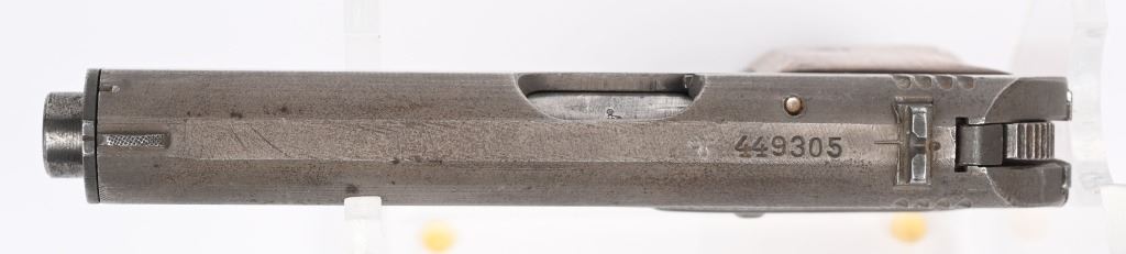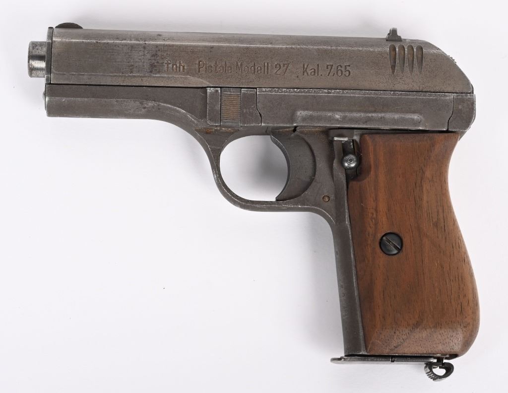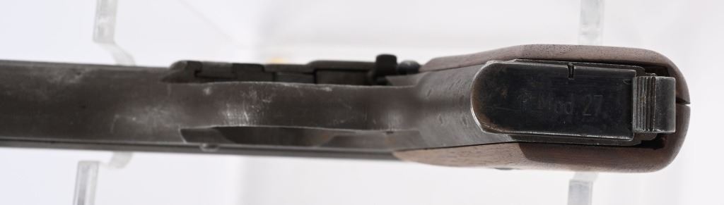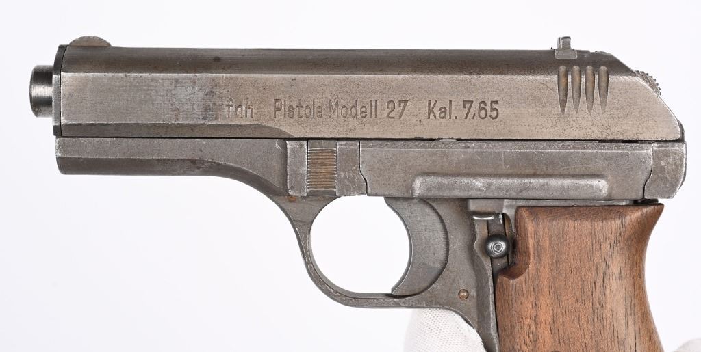 SERIAL NUMBER: 449305. BARREL: 4". CALIBER: .32 ACP/7.65MM. MANUFACTURED: 1945. Very late gun, with standard "eagle/WaA76" Waffenamt on the right side of the frame. No import marks. Matching serials on the frame and slide. Standard sighs and phosphate finish. Two piece wood grips have been sanded. Includes original blued steel magazine, marked "P.Mod. 27" on the bottom. CONDITION: Metal and grips are very good overall with light wear. Bore is lightly frosted, with strong rifling retained. Fine mechanics. Magazine has finish wear. C&R