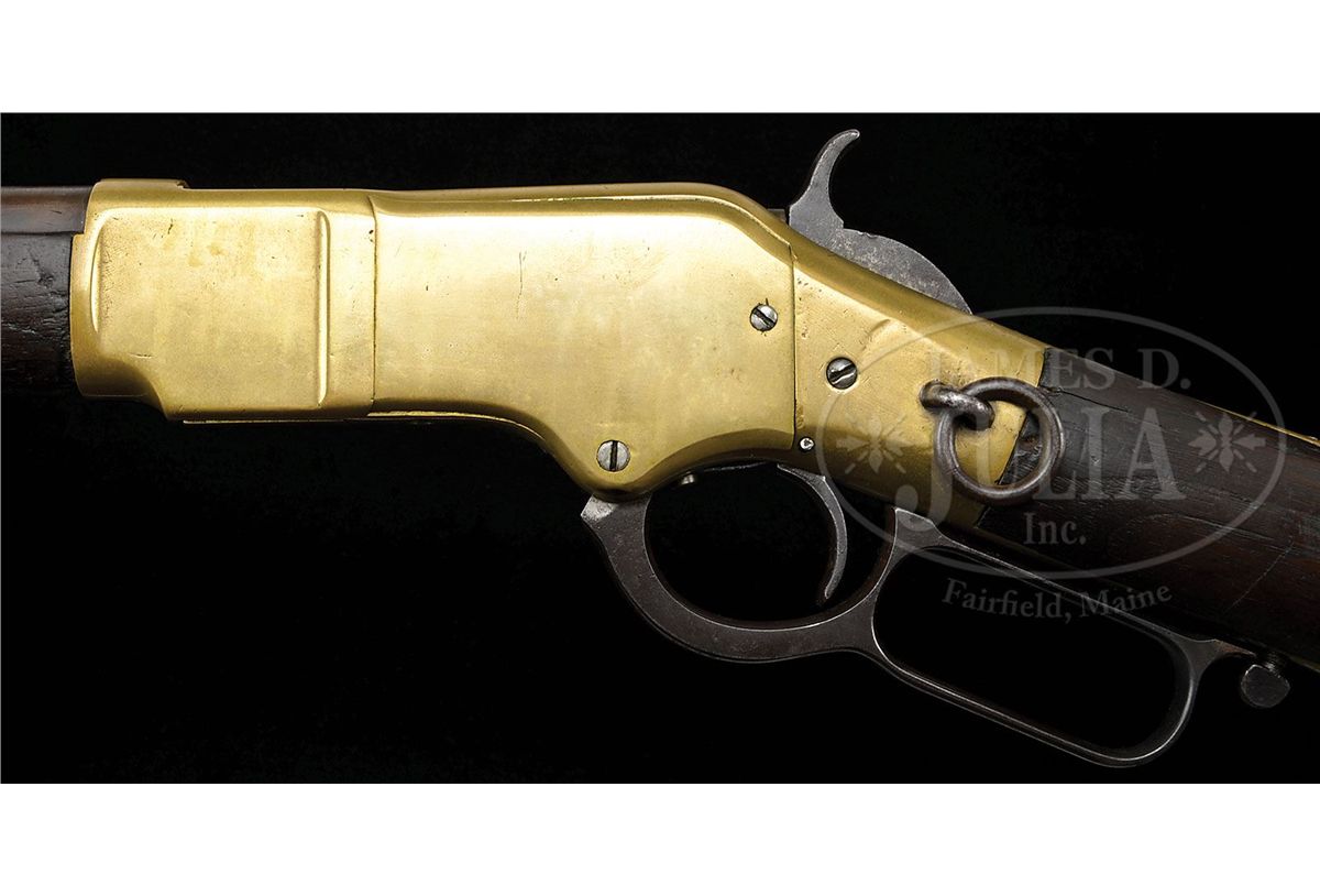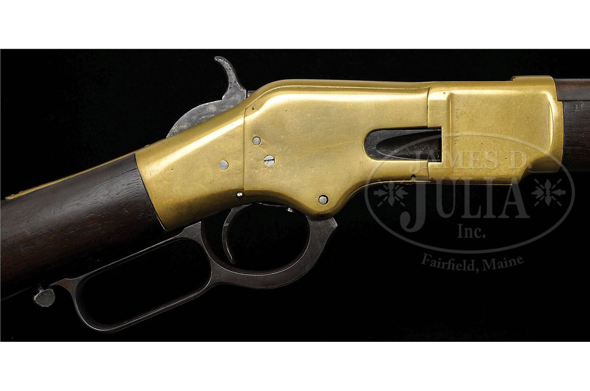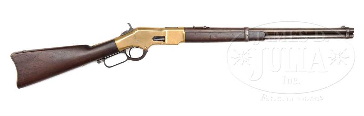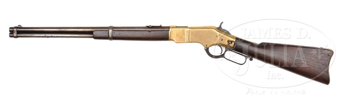 SN 157823. Cal. 44 RF Henry. Standard carbine with 20" rd bbl, full magazine, late style front band with square base front sight and a broken, late, replacement marbles carbine rear sight. Bbl has Winchester & King's Patent 2-line address. Left side of the receiver has staple & ring. Mounted with uncheckered, slab sawed American walnut with straight stock & brass carbine buttplate with trap. This carbine is typical of frontier used arms that was probably in the saddle scabbard on the American frontier. CONDITION: Fair to good. No orig finish remains with the bbl & magazine tube thin, cleaned silver brown patina. Receiver & buttplate show heavy wear with rounded corners has saddle ring wear on the receiver & has been recently polished. Lever & hammer are a dark patina. Stock has a crack in the wrist otherwise wood is sound with usual nicks & scratches and retains a dark hand worn patina. One or both of the timing screws are either broken or weak as the lever is loose for the first inch of travel. Trigger spring is a replacement. Mechanics are fine. Strong bore with moderate pitting. 4-48640 JR145