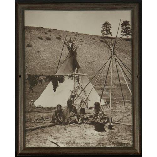PHOTOGRAPH: 10'' x 8'', Laton Anton Huffman (1854-1931), title: ''Two Moon Lodge, Lame Deer Mont. 1896''. Huffman captured the ever changing Montana history of his day and was the post photographer for Fort Keogh in Eastern Montana. Presented in a simple frame. Signed in the print ''L.A. Huffman'' and stamped on reverse ''L.A. Huffman-Coffrin Studio, Agent Miles City Mont.''