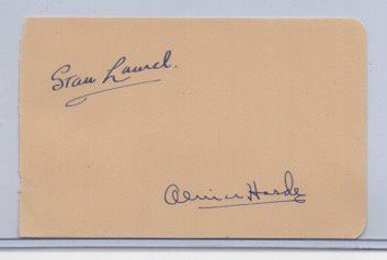 A Laurel and Hardy autographed album page. Laurel and Hardy were a comedy double act during the early Classical Hollywood era of American cinema. The team was composed of thin Englishman Stan Laurel (1890–1965) and heavyset American Oliver Hardy (1892–1957). They became well known during the late 1920s through the mid-1940s for their slapstick comedy, with Laurel playing the clumsy and childlike friend of the pompous Hardy. The duo's signature tune is known variously as "The Cuckoo Song", "Ku-Ku", or "The Dance of the Cuckoos". It was played over the opening credits of their films and has become as emblematic of the duo as their bowler hats.
