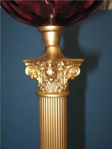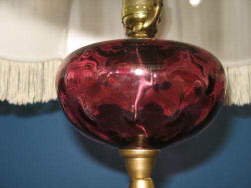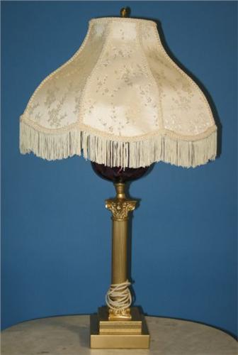 ORNATE TABLE LAMP WITH LAVENDER GLASS BOWL. Electrified. Metal stem. Boudoir shade. 31.5” H