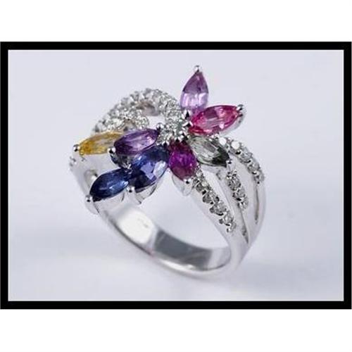 This beautiful ring has a nice range of sparkling colors! Made of 18K white gold, 7 multi-colored marquees cut sapphires are mounted into the ring along with 43 full cut diamonds. The sapphires weigh 2.33 carats and the diamonds weigh .56 carats TW. The size 6 ring measures 20 millimeters (13/16 inches) x 15 millimeters (19/32 inches).