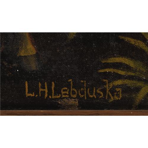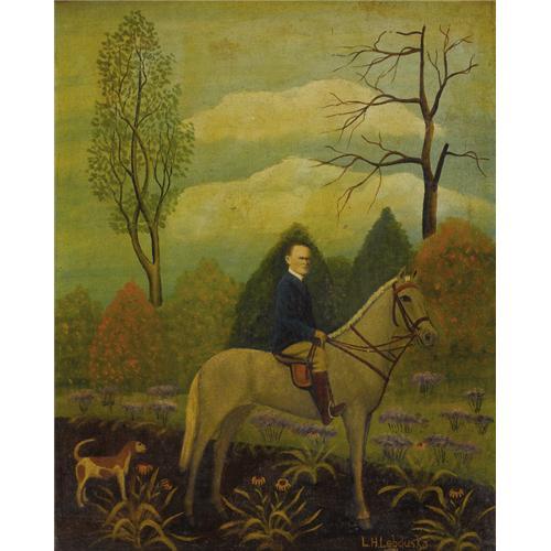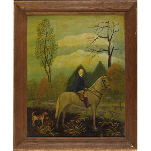 <B>LAWRENCE H. LEBDUSKA</B></I> (American 1894-1966)<BR><I>The Rider And His Dog</B></I><BR>Oil on canvasboard<BR>20 x 16 inches (50.8 x 40.6 cm)<BR>Signed lower right: <I>L.H. Lebduska</B></I><BR><BR> <B>Condition Report:</B> yellowed varnish on surface, in good condition, one area of paint loss beneath the signature (.5 inches, wide)<BR><BR><b>Shipping:</b> Requires 3rd Party Shipping (<a target="_blank" href="http://www.heritageauctions.com/common/shipping.php">view shipping information</a>)
