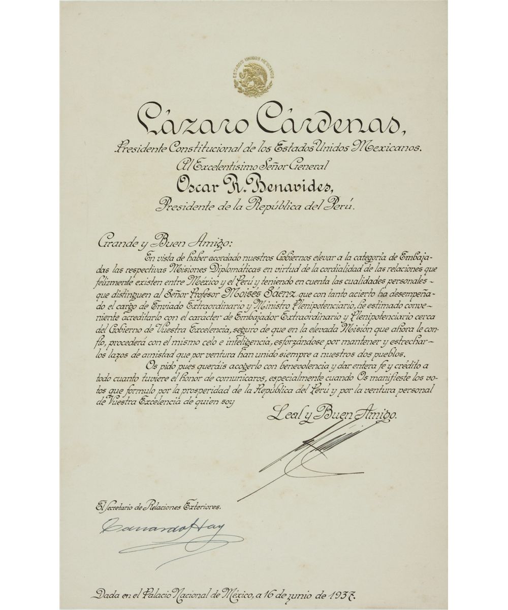 (1895-1970) President of Mexico from 1934-1940, whose term was marked by reform and unionization efforts. Manuscript L.S. 1p. folio, June 16, 1937, to President of Peru, Oscar Benavides, appointing Moises Saenz as Envoy and Minister Plenipotentiary to Peru. Boldly signed at conclusion, mounting traces to blank final page, very good. Moises Saenz Garza (1888-1941) was a Mexican educator and diplomat who is largely credited with reforming the educational system to address the needs of rural and indigenenous populations.
