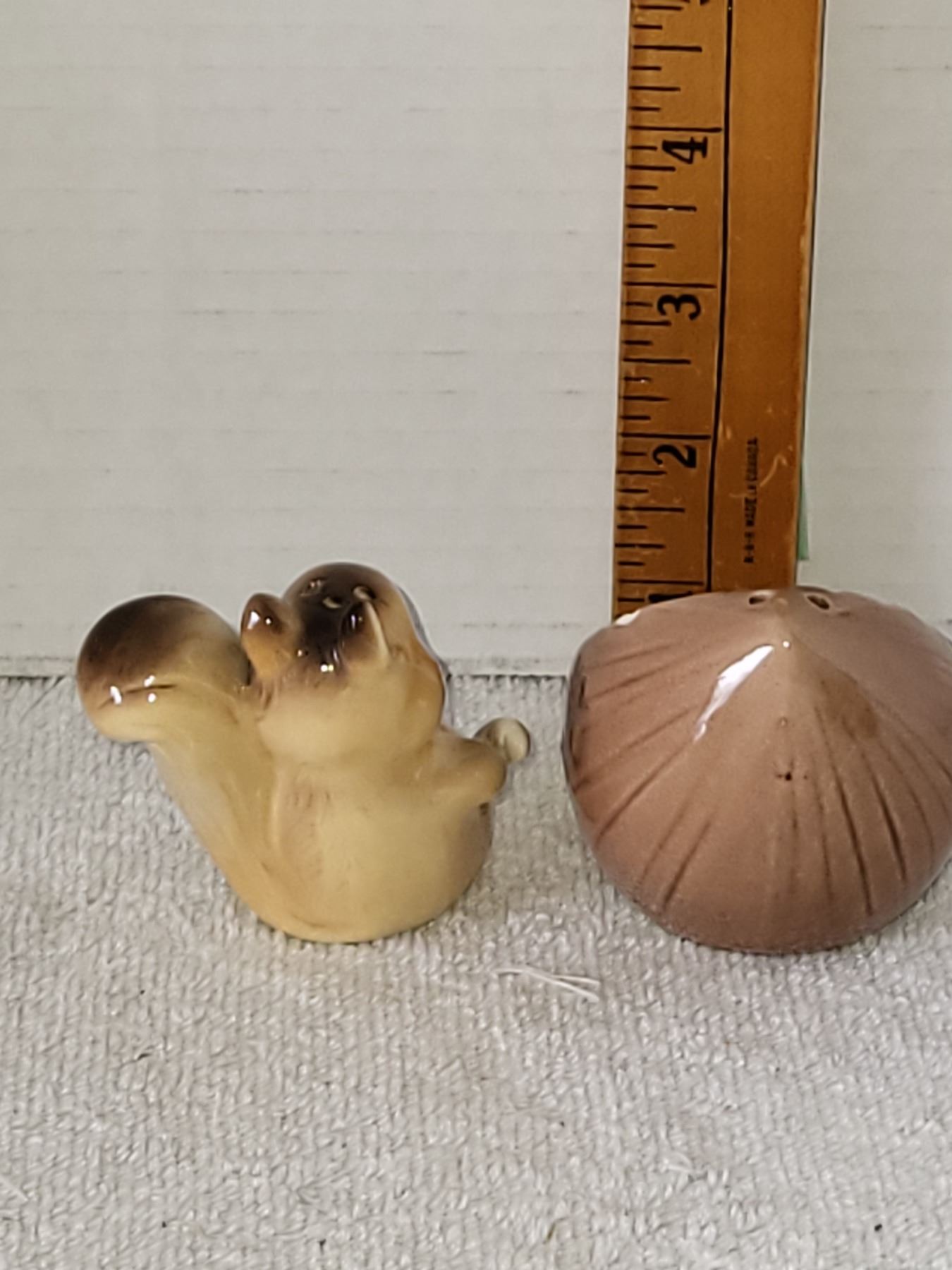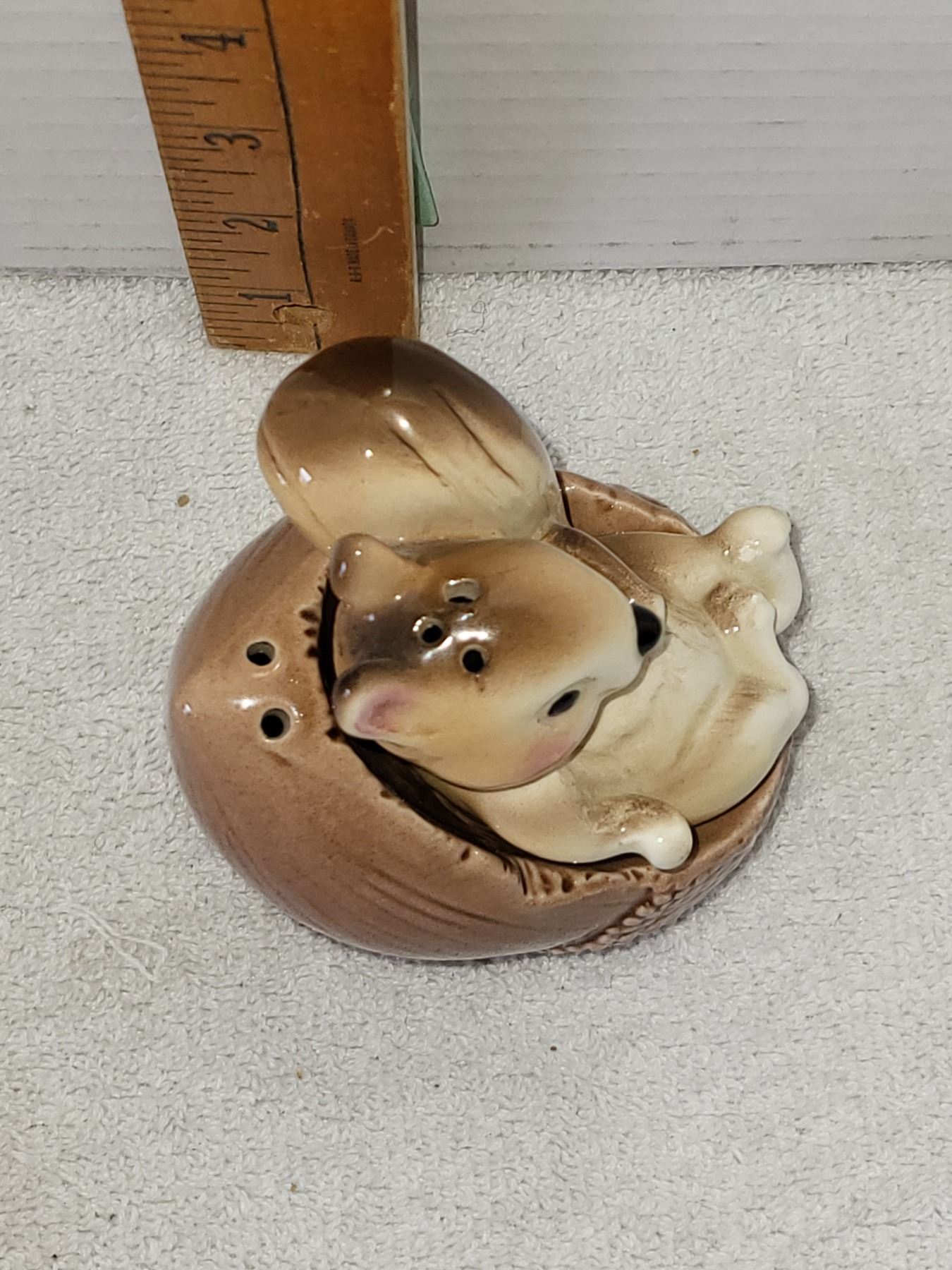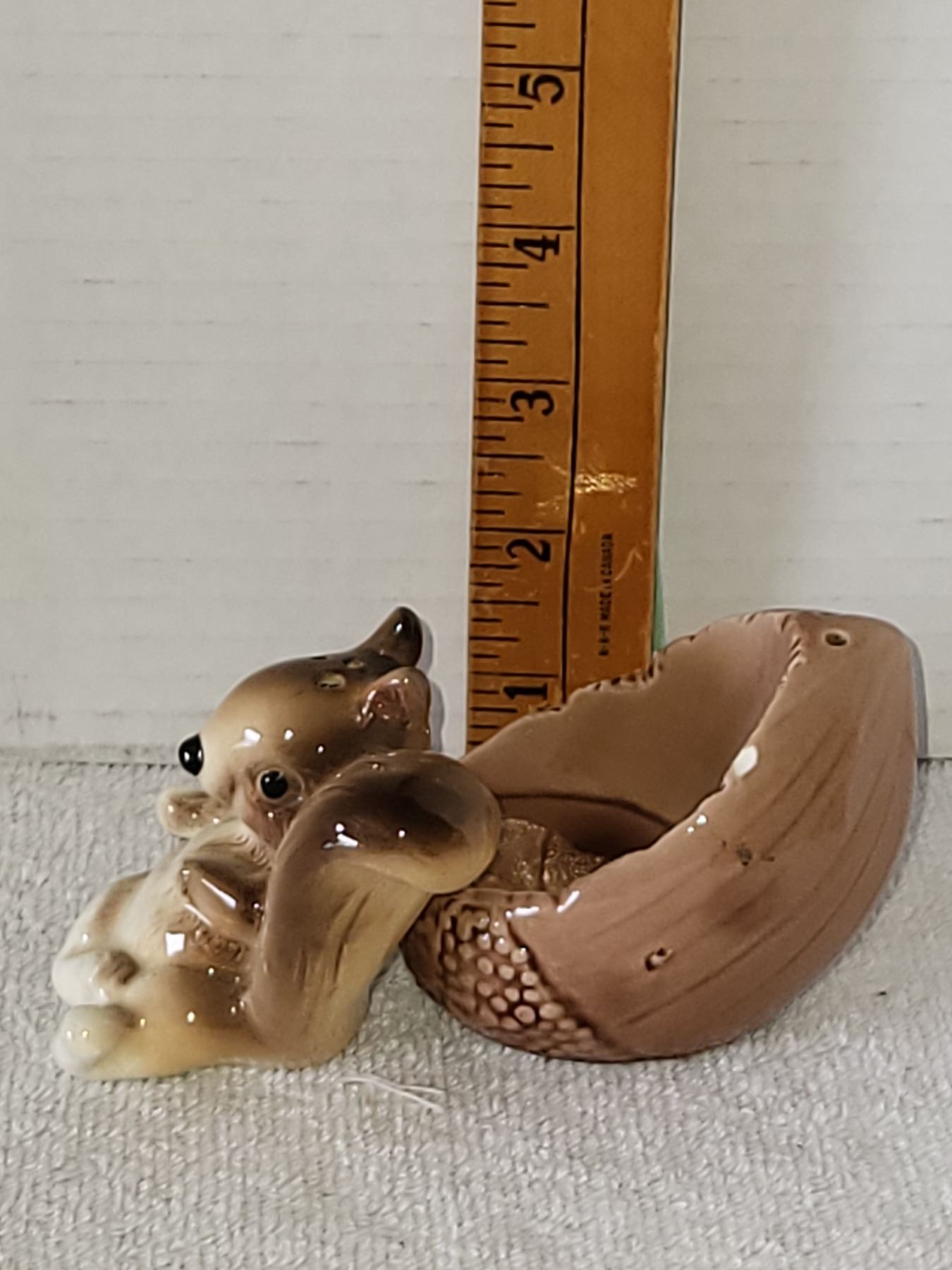 LAZY SQUIRREL IN A NUT SALT AND PEPPER SHAKER SET MADE IN JAPAN. MEASURES 3" X 3.25"