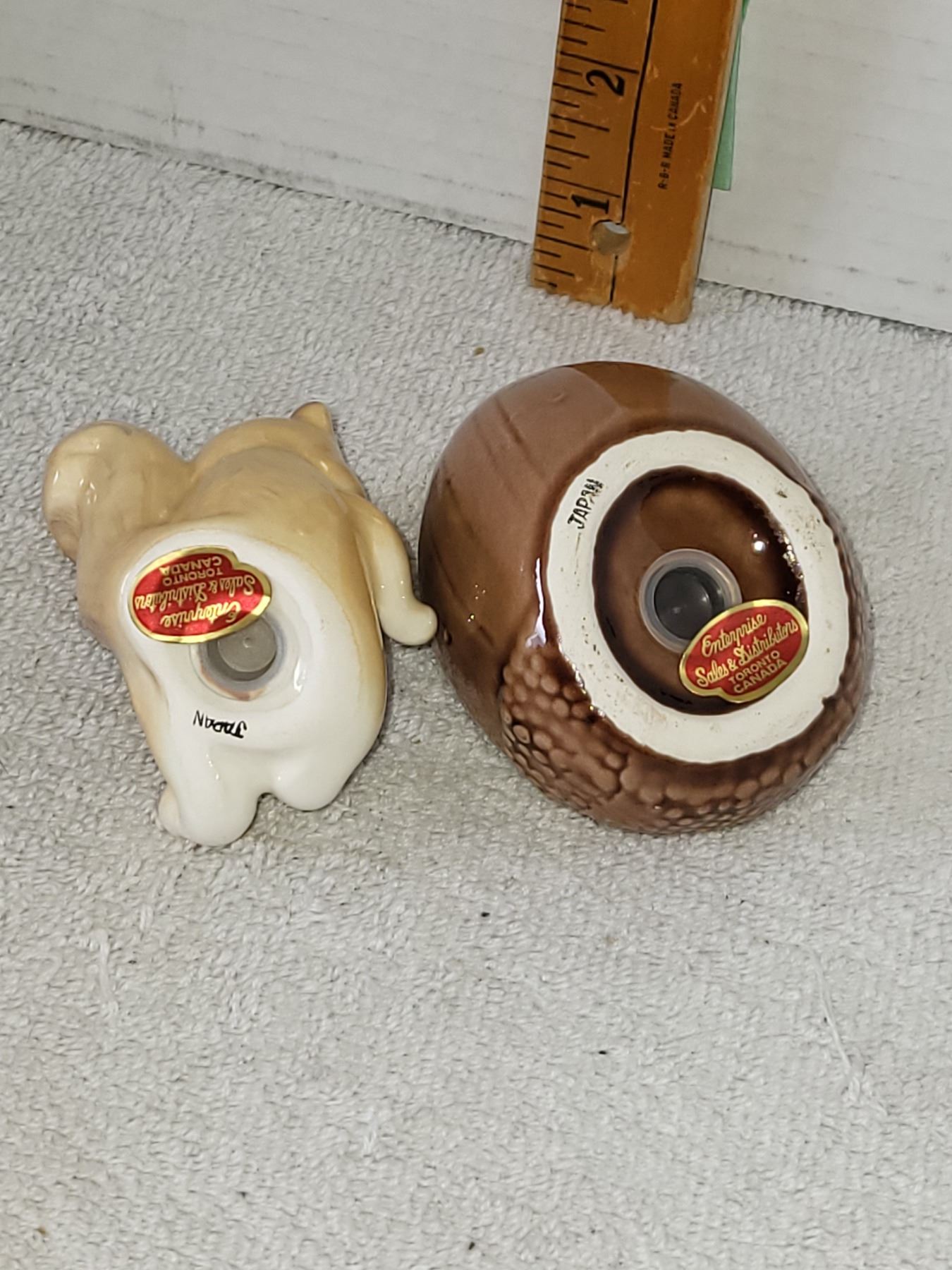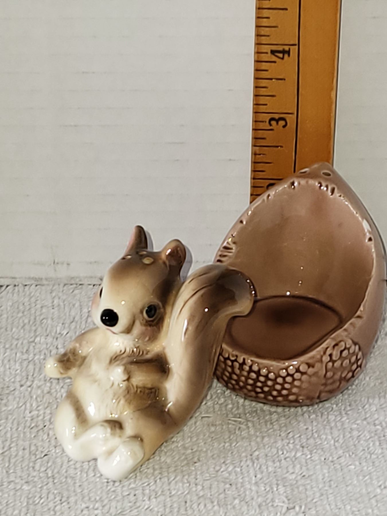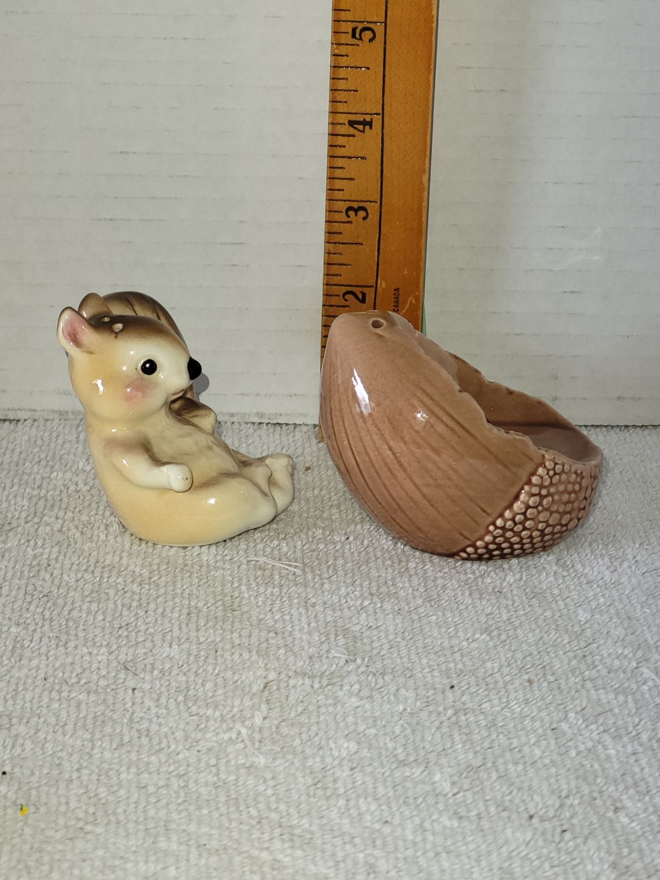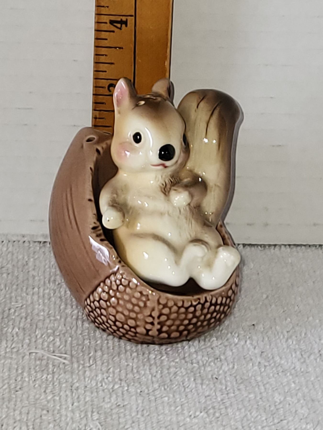 LAZY SQUIRREL IN A NUT SALT AND PEPPER SHAKER SET MADE IN JAPAN. MEASURES 3" X 3.25"