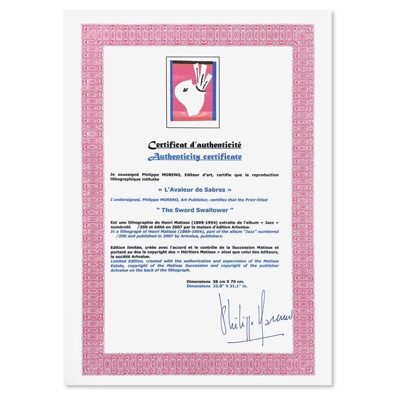 "LAvaleur de Sabres (The Sword Swallower)" is a limited edition lithograph by Henri Matisse (1869-1954). This piece comes from an edition of 200 authorized by the Matisse Estate; the edition number is not on the piece itself but on the certificate. This piece comes custom framed. Includes Certificate of Authenticity. Measures approx. 29" x 37" (frame) 23" x 31" (image).