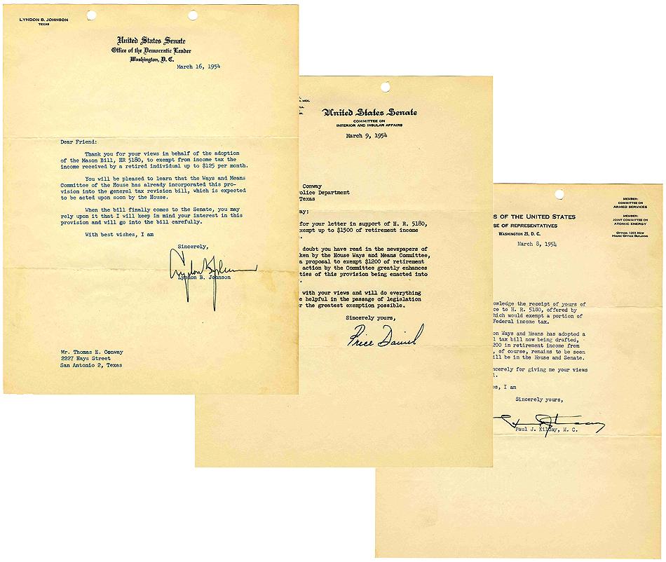 Lyndon B. Johnson typed letter signed as a member of the U.S. Senate. Single page, 8” x 10.5” document typed on official U.S. Senate stationery. Dated 16 March 1954 and addressed to Thomas E. Conway, the letter discusses a bill that is about to go before the Senate. Johnson promises to keep in mind Conway's interests when going through the bill. Signed in faded black ink, “Sincerely, Lyndon B. Johnson.” Some mild foxing and wear to creases, otherwise excellent. Includes supporting letters related to same bill.
