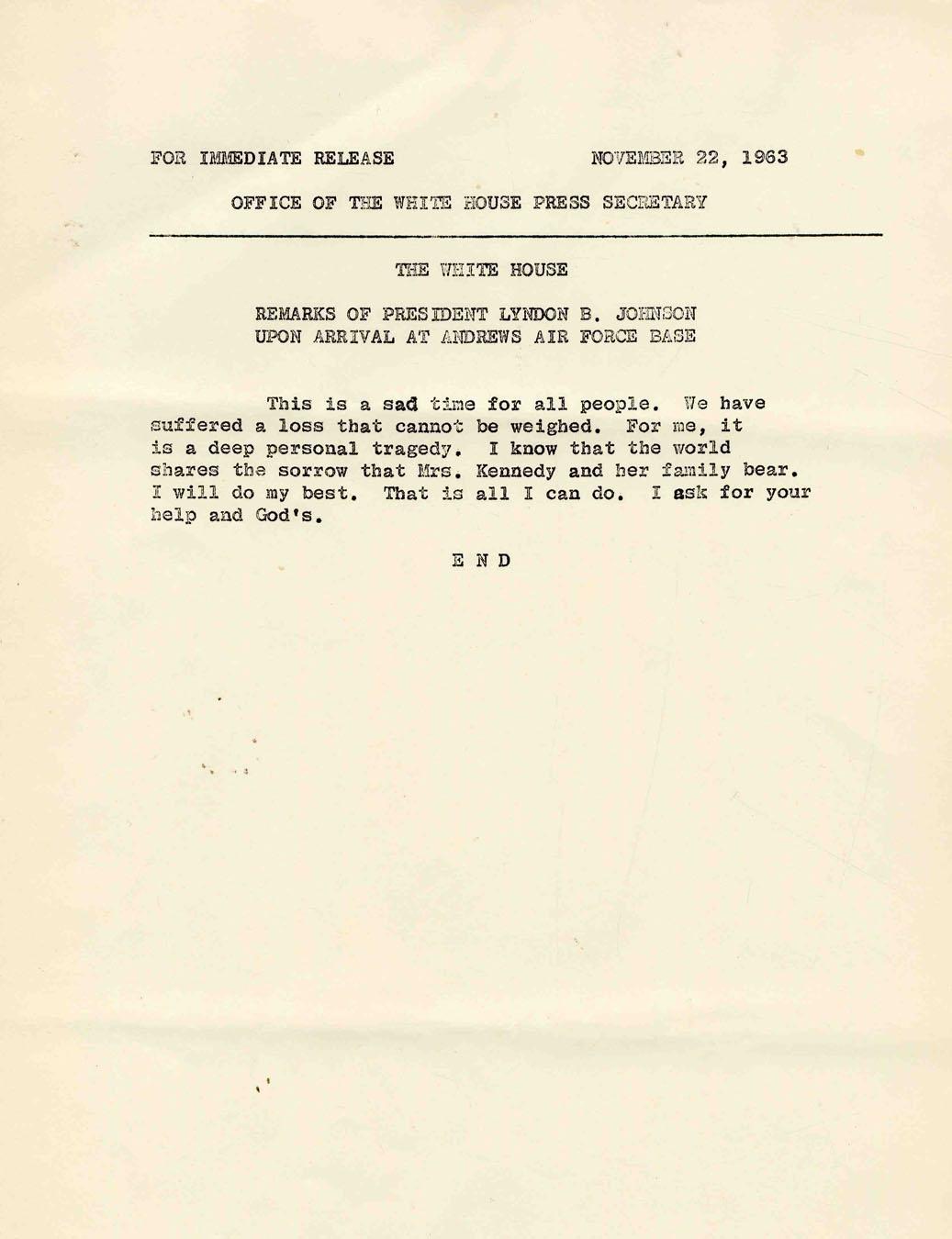 Original copy of press release from the Office of the White House Press Secretary dated 22 November 1963. Document transcribes LBJ's remarks upon his arrival at Andrews Air Force Base, in part: ''This is a sad time for all people. We have suffered a loss that cannot be weighed. For me, it is a deep personal tragedy…'' Single page measures 8.5'' x 11''. Minor crease to upper left corner, else near fine condition.