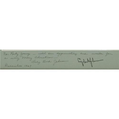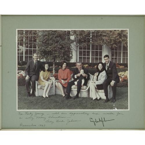 <B>LBJ and Lady Bird Inscribed Signed Photograph,</B></I> "<I> For Ruby Youngs - with our appreciation and wishes for a very Merry Christmas - Lady Bird Johnson Lyndon B Johnson December, 1967</B></I>". The entire Johnson clan poses on the White House lawn for this color portrait, (14.5" x 11.5"). The inscription on the lower margin is in Lady Bird's hand save for the President's signature. A small area of emulsion loss not affecting the subjects or the inscription. Minimal fading from sun exposure, Very Fine condition. In wooden frame, 16.0" x 13.0".