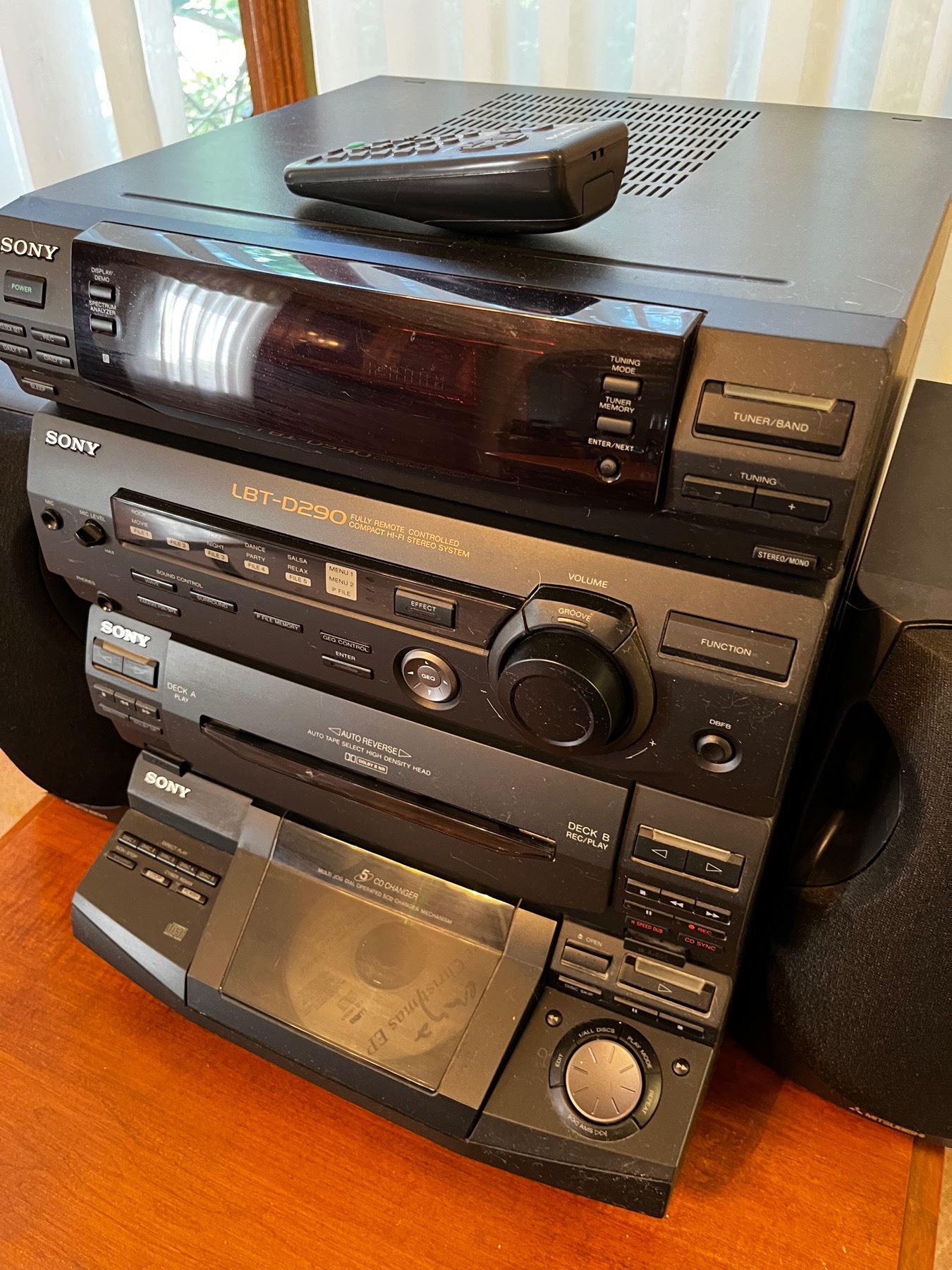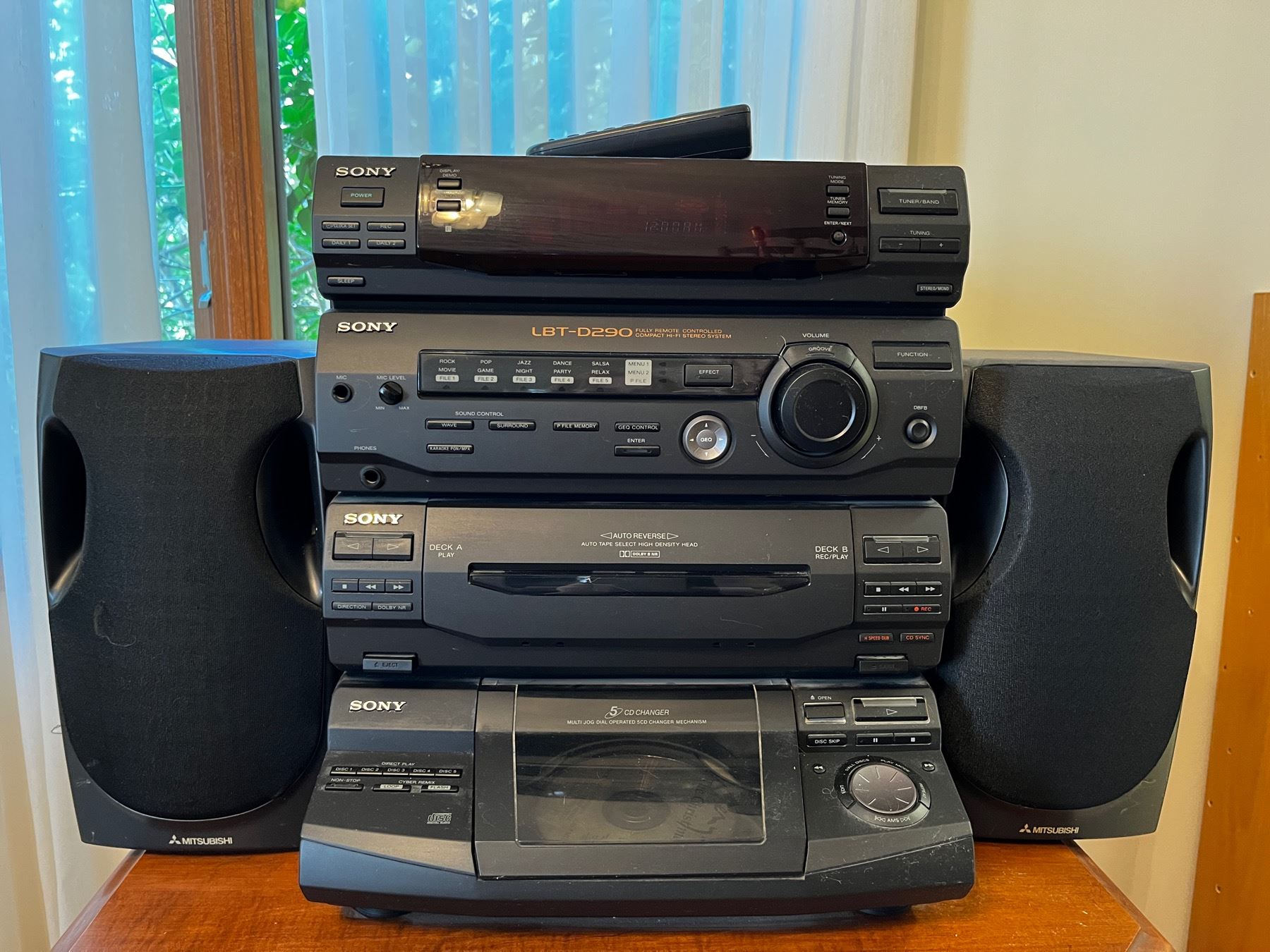 with multi deck cd players and mitsubishi speakers included. System measures 17x14x16". speakers 13x7x9.5"