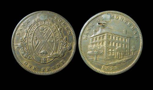 LC-11a1 Breton # 513 One penny token 1838 "Side view" EF with some red lustre remaining. Some marks and plugged. Extremely rare and seldom offered!