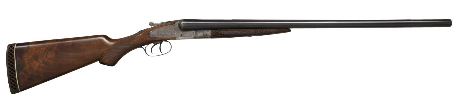 SXS SHOTGUN. Cal. 12 Ga., 2 3/4". S# FWE23243 (1920). Of the 2,700 - 12 Gauge Trap Grades, only 301 were made w/ 26" bbls. Crown Steel bbls. marked "L.C. SMITH TRAP GRADE" & "HUNTER ARMS CO. INC. M'F'R'S FULTON, N.Y. U.S.A". Fixed Imp. Mod & Imp. Cyl. chokes. Slightly raised concave matted rib w/ front bead. Sideplate receiver showcases Trap Shooting scenes highlighted by foliage border engraving. Action features dbl. triggers, auto ejectors & automatic safety. Ebony tip splinter forearm. Pistol grip walnut stock w/ visually appealing fiddle figure & hard rubber grip cap. LOP: has been shortened to 13 1/4" over Pachmayr White Line pad. DAC: 1 1/2". DAH: 2 3/4". WEIGHT: 6.74 lbs. CONDITION: bbls. have good blue finish w/ scattered peppery patina & light marks. Action has faded to a gray patina showing wear along edges, faint colors in protected areas & heavy patina along trigger guard bow. Wood has been lightly sanded & refinished alongside re-freshened checkering having a very good overall appearance. Good shiny bores w/ a few sm. dents. (23-2171/MD). MODERN. $600-900.
