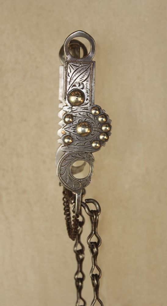 Fantastic early engraved iron spade bit with multiple silver domes silver rope inlay, in mint unused condition. A great early bit.
