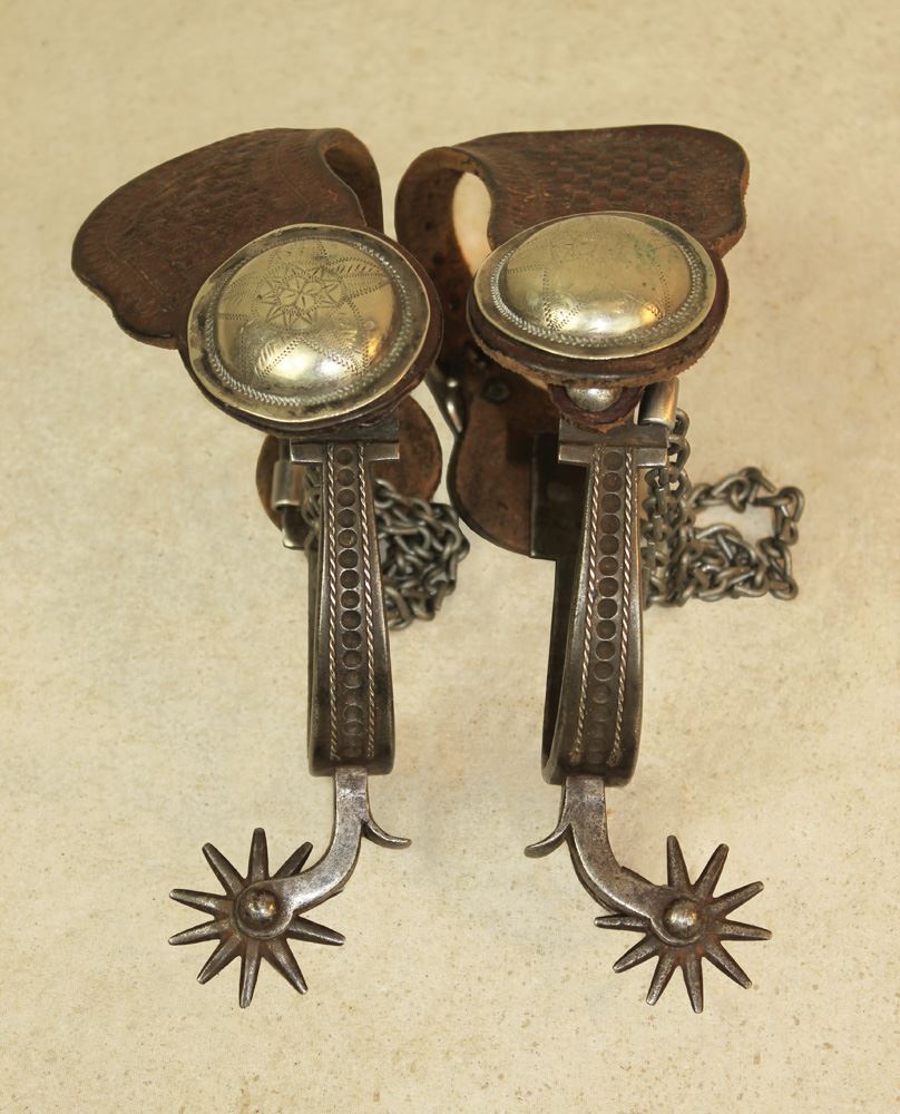 Very early drop shank iron spurs with unusual single mounted design and silver rope inlay. Nicely marked by a rare and highly sought after maker.