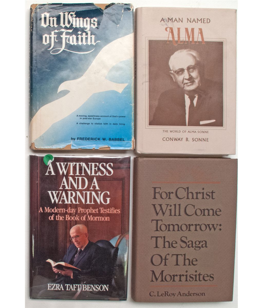 1) A Witness and a Warning by Ezra Taft Bensen. 2) For Christ Will Come Tomorrow: The Saga of the Morrisite. 3) A Man named Alma, The World of Alma Sonne. 4) On Wings of Faith by Frederick W. Babbel 5) A Witness and a Warning by Ezra Taft BensenCity: County: State: UT