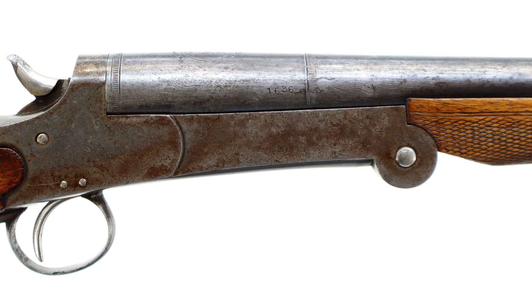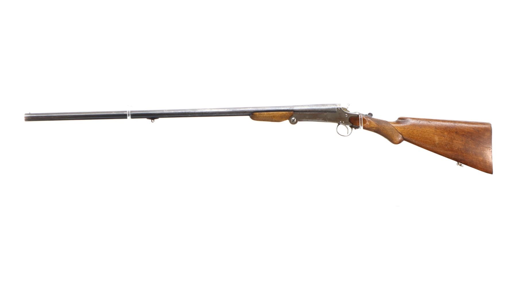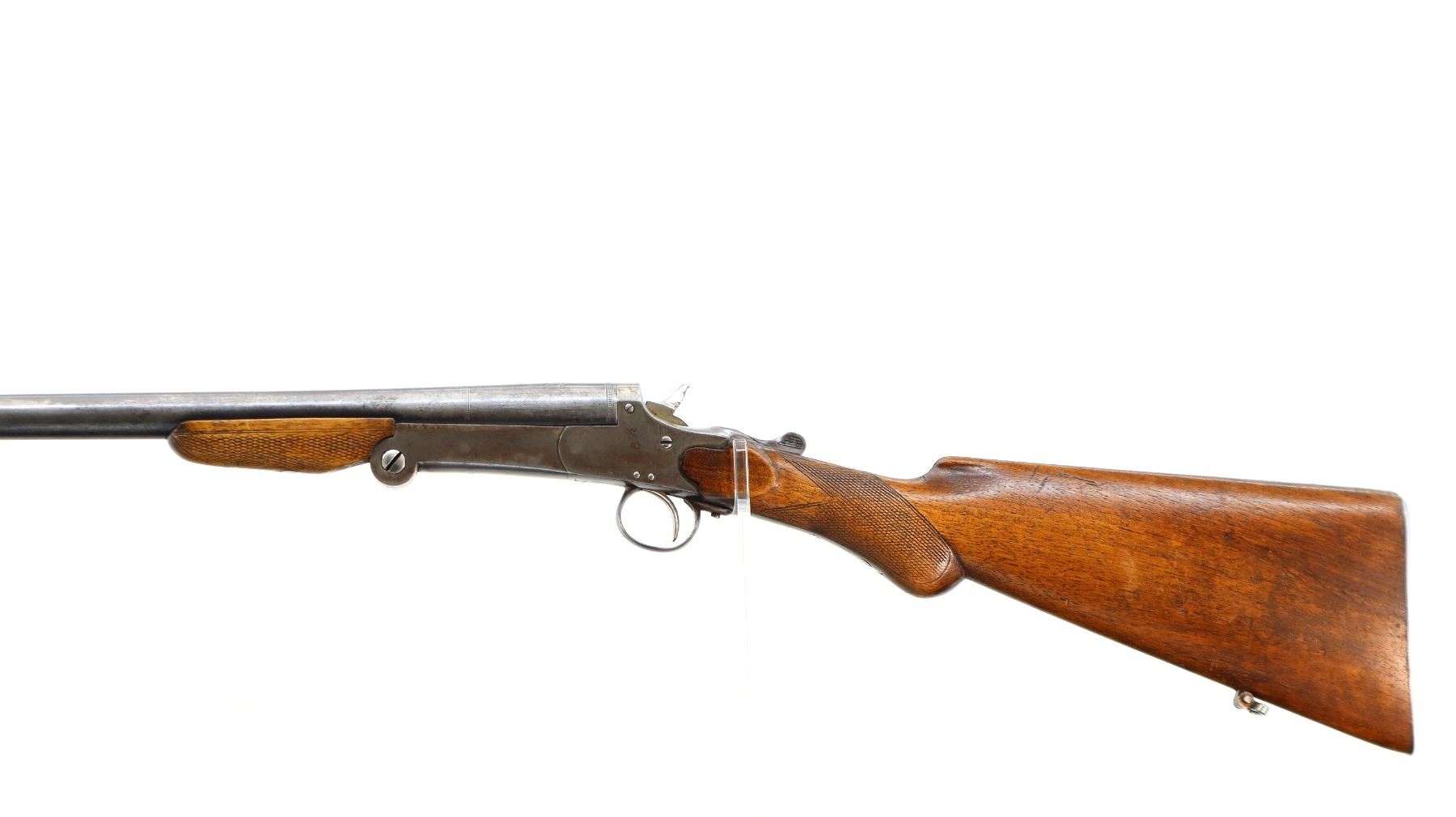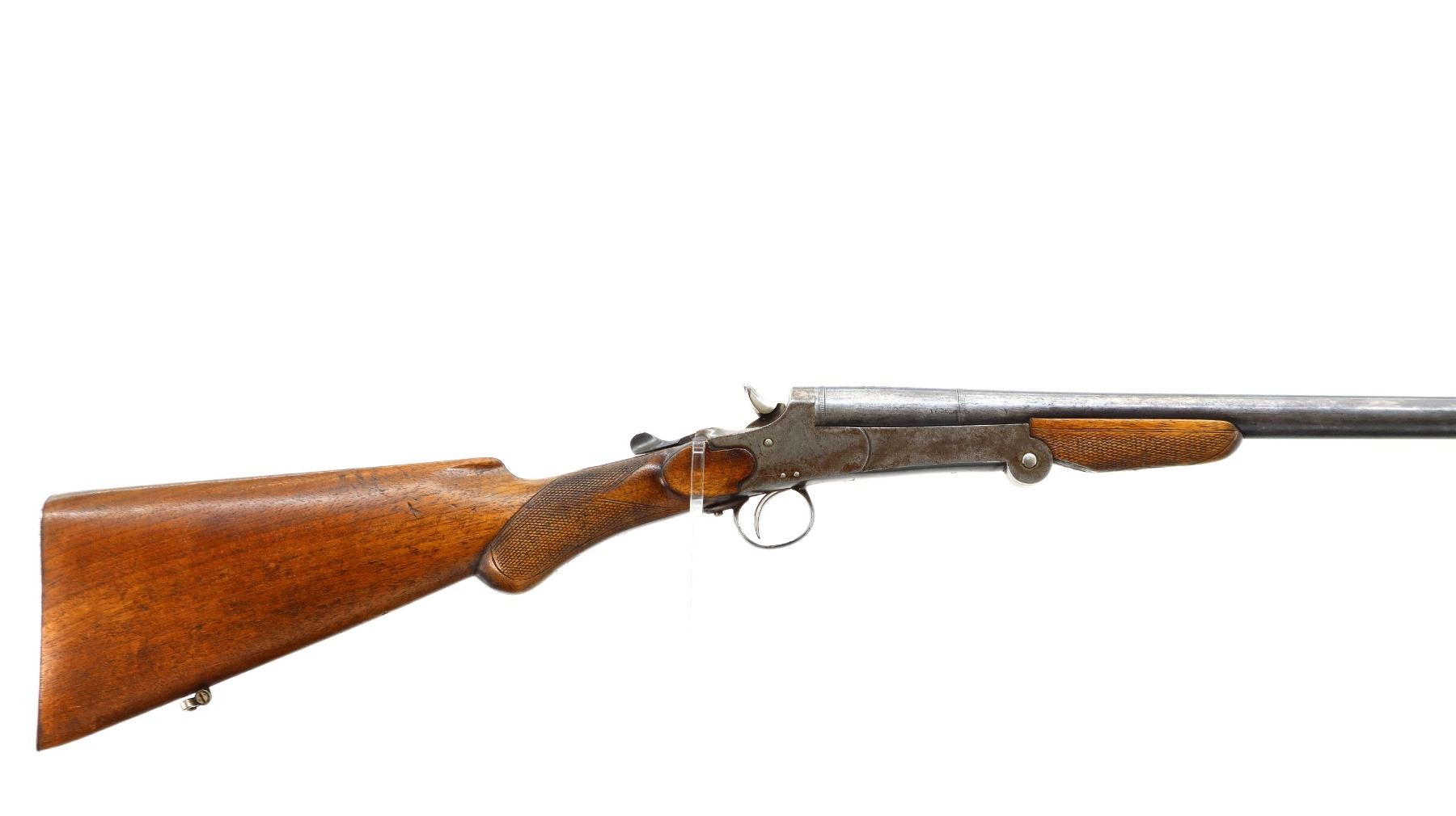 Main Description: Brass bead, round barrel, checkered spur hammer, extractor. Two piece wood stocks, checkered forearm and pistol grip chipped and cracked behind receiver, smooth steel butt plate cracked at heel, rear swivel front stud.