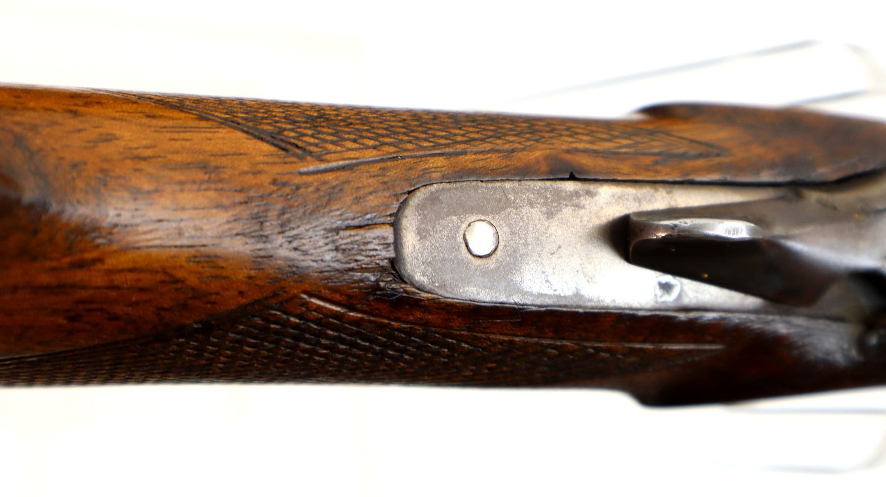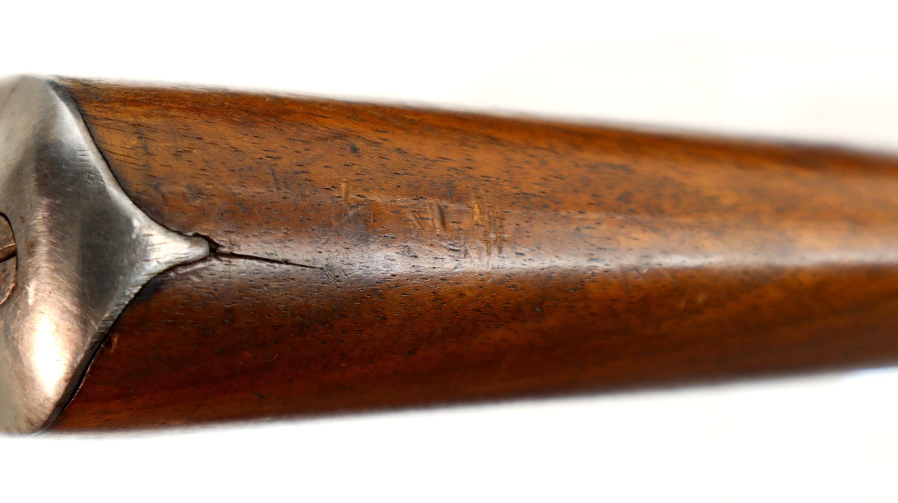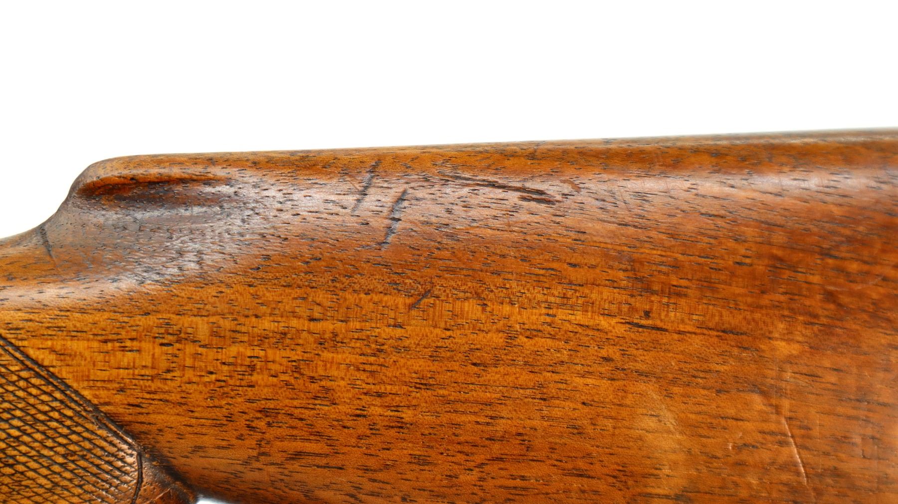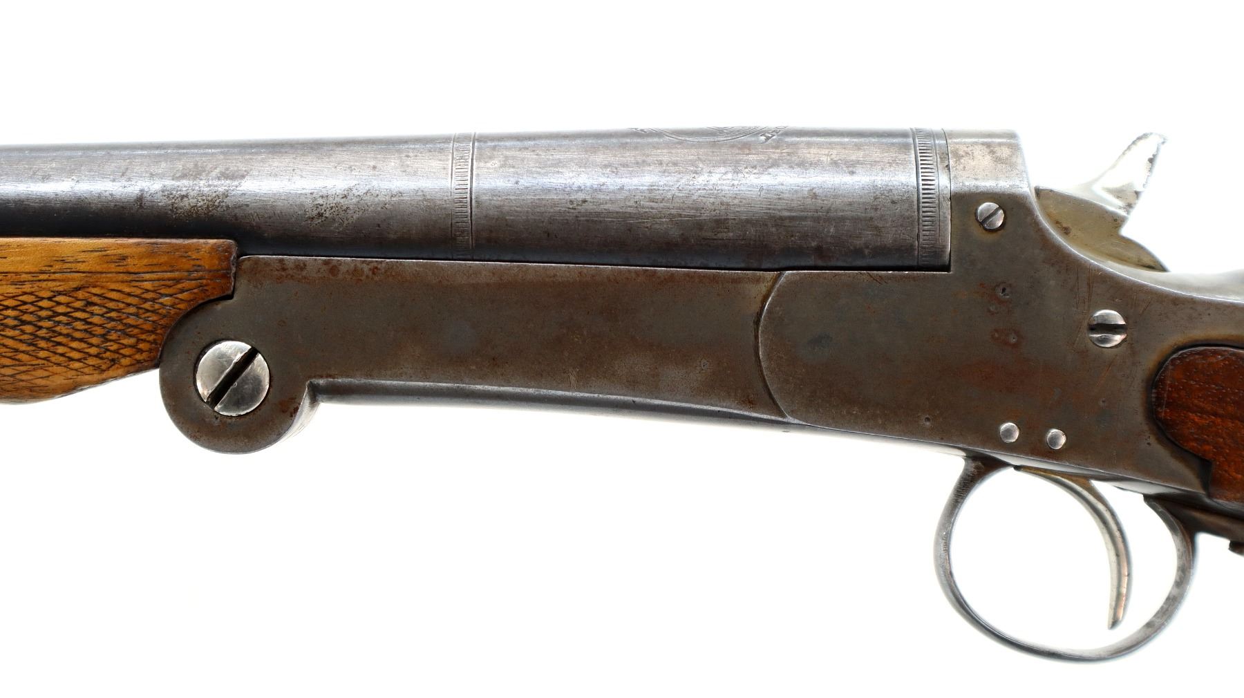 Main Description: Brass bead, round barrel, checkered spur hammer, extractor. Two piece wood stocks, checkered forearm and pistol grip chipped and cracked behind receiver, smooth steel butt plate cracked at heel, rear swivel front stud.