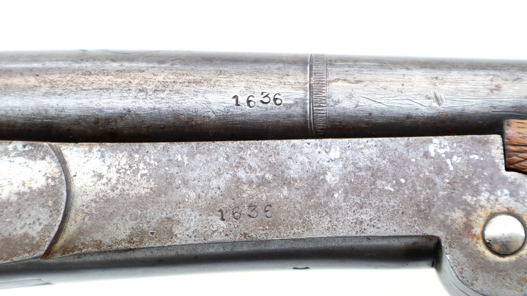 Wear: Metal finish turning silver grey with light rust speckles, scratches, handling marks and wear. Stocks show marks, scratches and wear.
