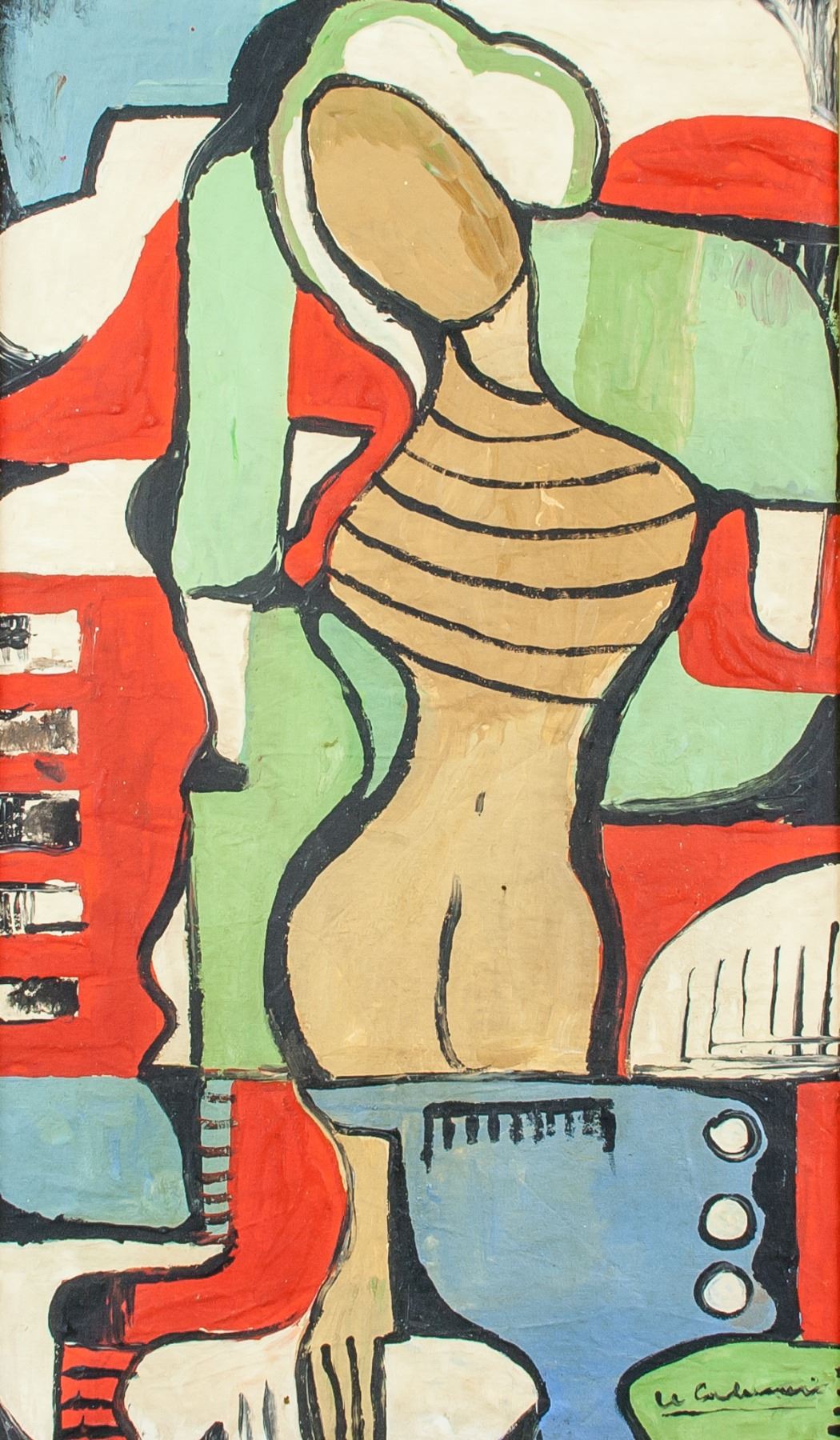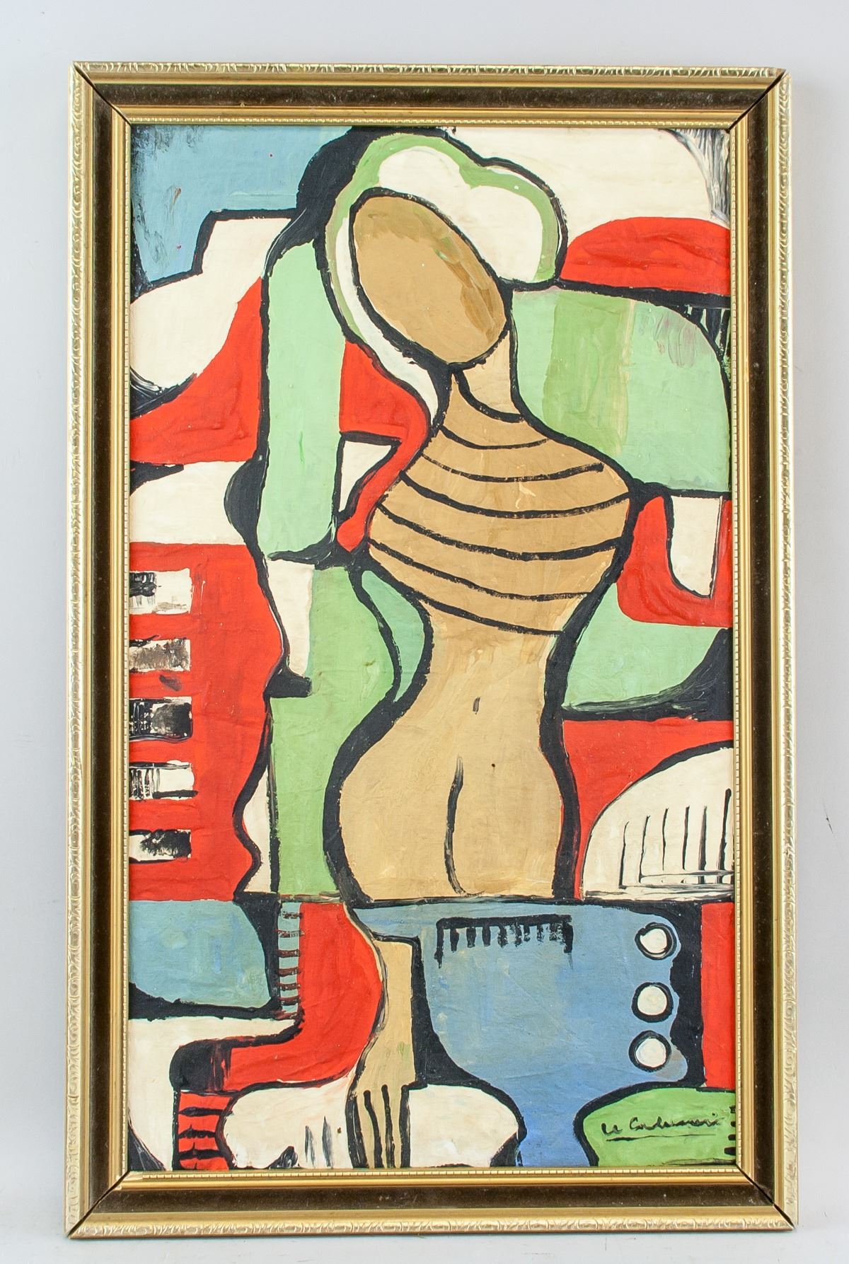 Oil on canvas, framed. Featuring an abstract figure. Signed and attr. Le Corbusier (French, 1887-1965) on the lower right corner. 58 x 34 cm (22.8 x 13.4 inches), frame: 65 x 41 cm (25.6 x 16.1 inches). Le Corbusier was visionary writer, theorist, and architect, and a lesser-known painter. Born Charles-edouard Jeanneret, he adopted his moniker when he began to author architectural designs and paintings. He had a fascination with proportion, modularity, and geometry, often taking his cue from classical architecture theory. His designs, however, were modernist and industrial. He fondly called houses “machines for living in,” and said that the base principal for design is that “it must be beautiful.” Le Corbusier was interested in solving what he called the problem of urban co-habitation, and produced a great number of designs for houses and apartment buildings. Le Corbusier worked at the atelier of Peter Behrens, the training grounds of other architectural masters like Mies van der Rohe and Walter Gropius. PROVENANCE: Southern Ontario estate