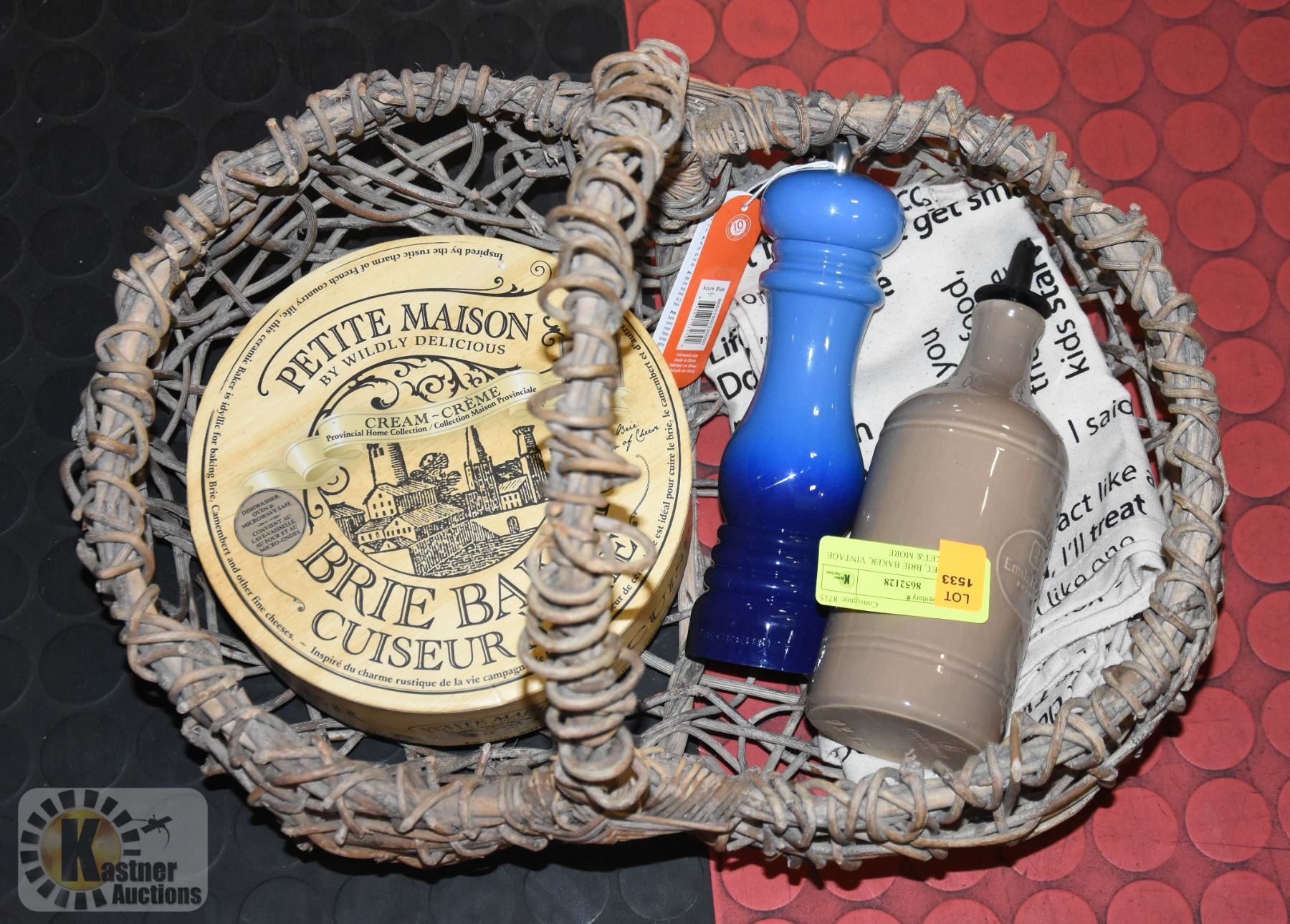 LE CREUSET PEPPER MILL, BRIE BAKER, EMILE HENRY FRANCE OIL DISPENSER, COTTON DISH TOWELS, VINTAGE WOVEN EGG BASKET. ESTATE.-