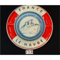 6" Le Havre souvenir ashtray in red, white and blue ceramic, shaped like a life preserver. Raised image of a 2-stack ocean liner in the center. Good condition.