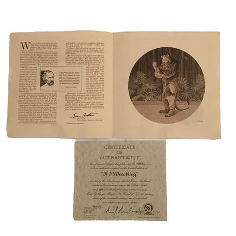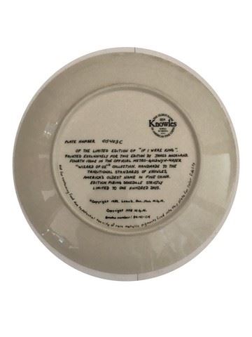 Limited edition Knowles Wizard of Oz ceramic plate with a painted picture of the cowardly lion. The plate is labeled "if I Were King". The plate is numbered 05403C and is painted by the American portraits James Auckland under the exclusive commission as the plate for any only official collector plate series commemorating MGM’s the Wizard of Oz. Comes with certificate of authenticity and a pamphlet about the collection.