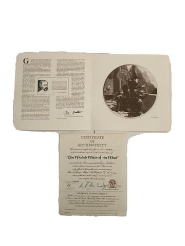 Limited addition KNOWLES Wizard of Oz ceramic plate featuring the Wicked Witch of the West, painted by the American portrait of James Auckland under exclusive commission as the plate number five in the only official collector plate series commemorating MGM’s Wizard of Oz. The plate is numbered 07692A. Comes with certificate of authenticity and a brochure about the Wizard of Oz collection.