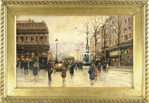 LE ROUX (20th Century) PARISIAN STREET SCENE. This lovely oil on panel is nearly similar, and perhaps almost identical to the works of Edouard Cortes. Depicts a late 19th or early 20th century Parisian street scene with numerous figures, apartments, store fronts, and a horse-drawn carriage. Signed in lower right, framed in an old gesso gold frame. SIZE: 16” h x 24” w. CONDITION: Oil in very good condition. Frame with minor imperfections. 8-87340