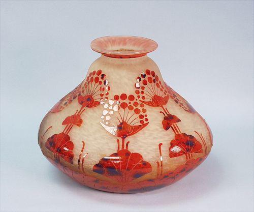 LE VERRE FRANCAIS - "Decor Airelle." A large French cameo glass vase. The bulbous body with fused opaline ground overlaid with fire polished red and blue flowers. Signed. 13" diameter, 10" high. Circa 1935.